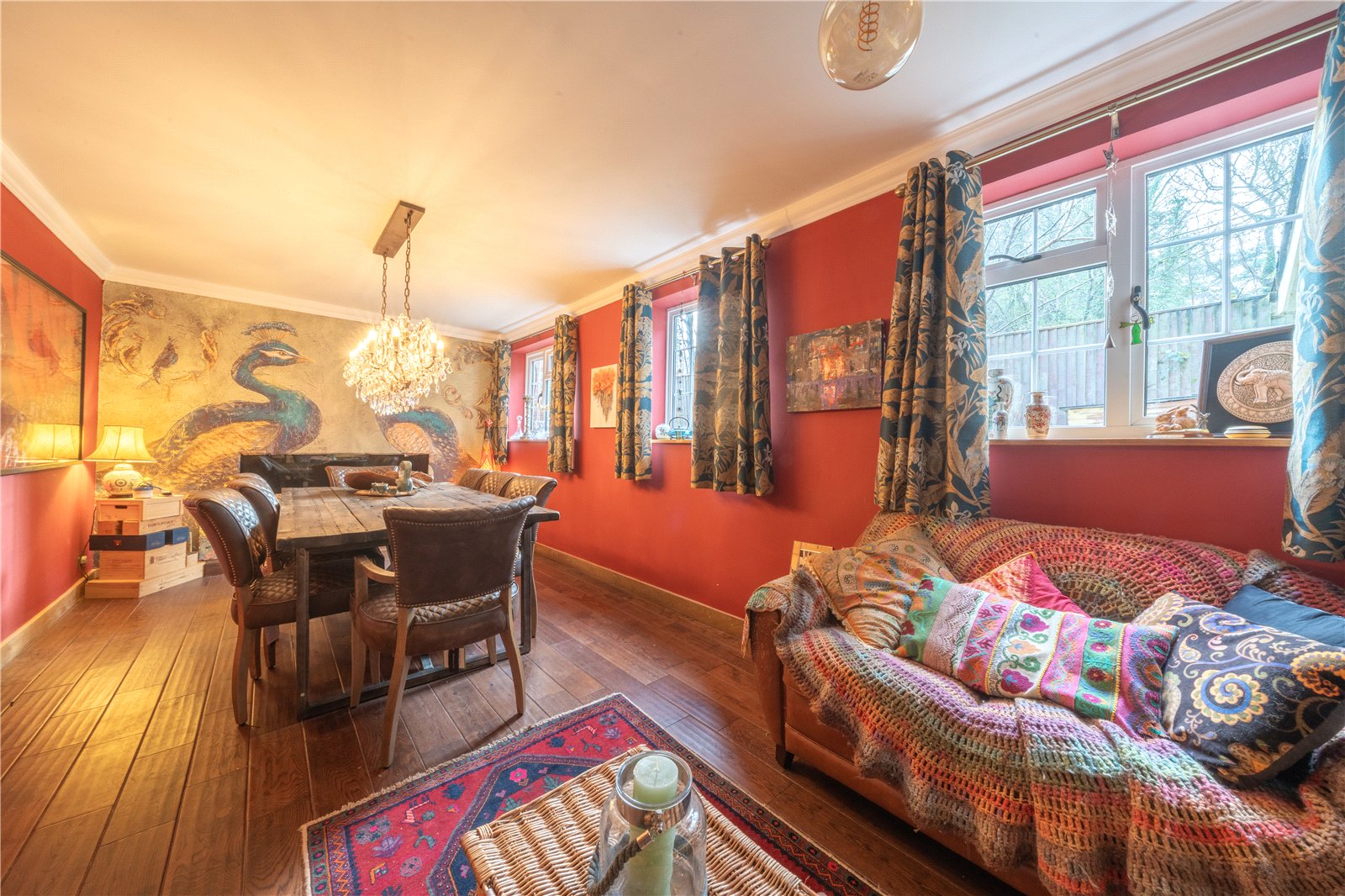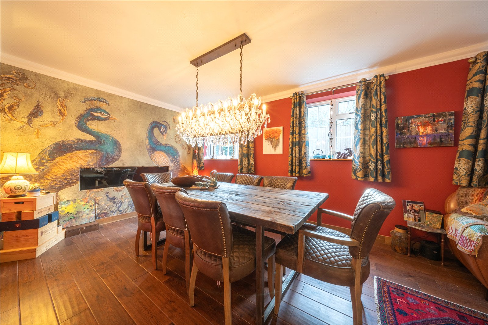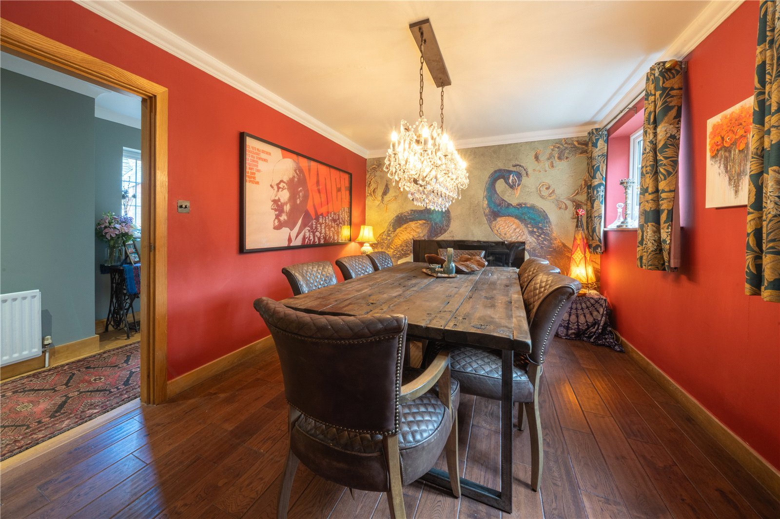 The room benefits from wooden flooring, complementing the overall warmth of the space, and its layout allows for additional furniture such as sideboards or occasional seating if desired. Overall, this is a distinctive and well-presented dining room that lends itself perfectly to both formal entertaining and memorable family gatherings.