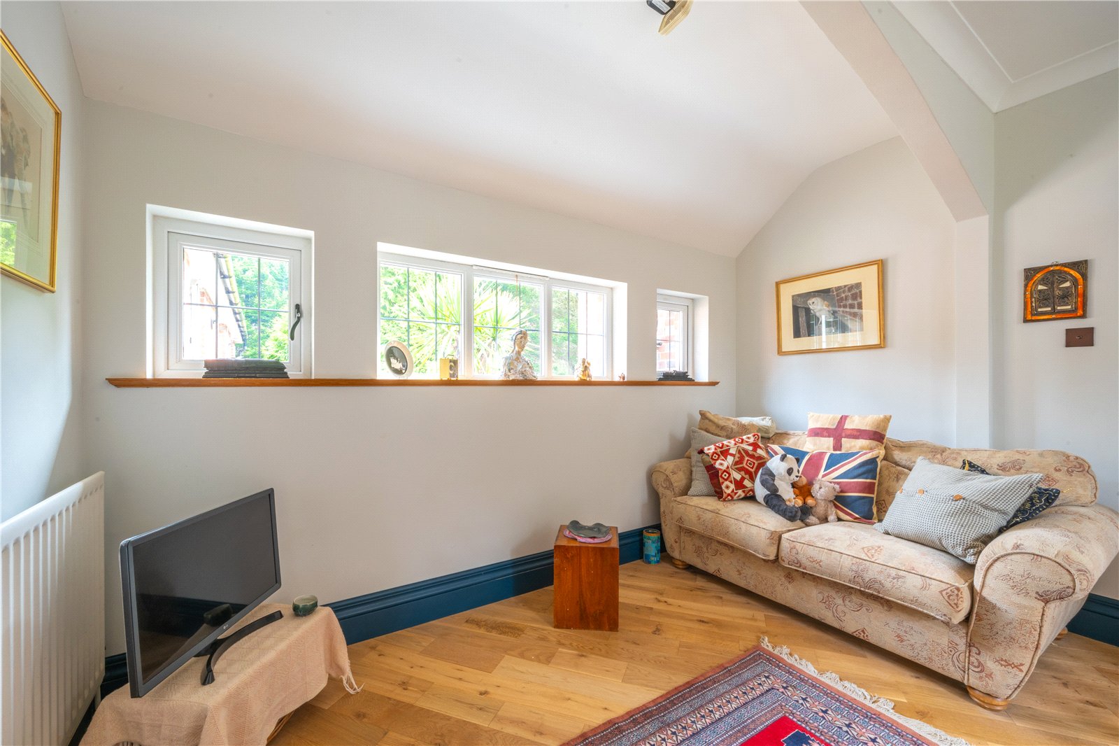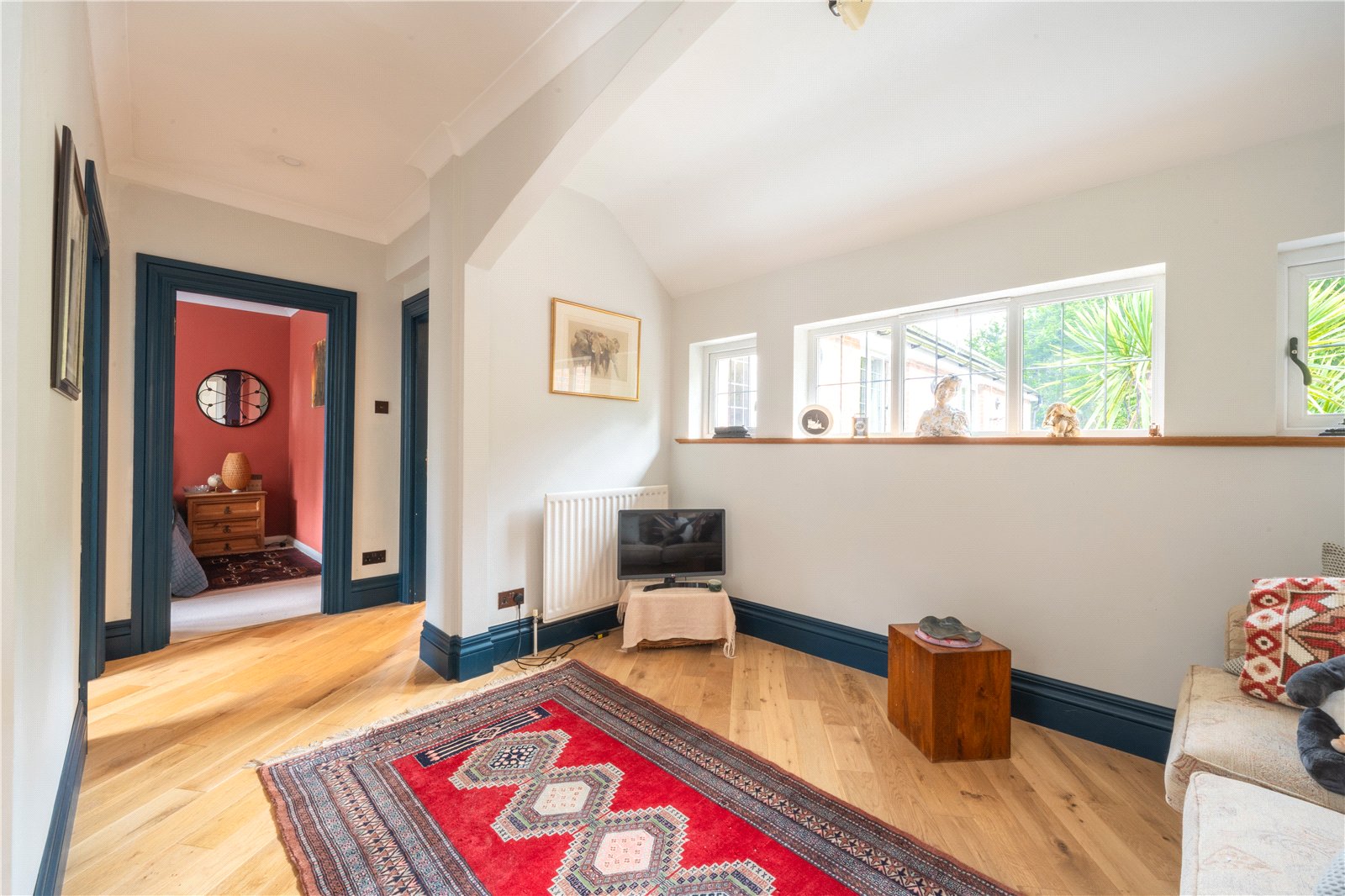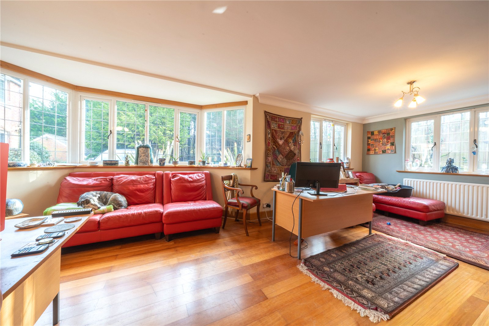BEDROOM 5: This generously proportioned bedroom enjoys a bright and airy feel, enhanced by a series of windows set along one wall that allow excellent levels of natural light and outlook over the surrounding greenery. Finished in a soft, neutral palette, the room features attractive wood flooring and well-defined proportions, comfortably accommodating a double bed along with additional seating or storage furniture. The layout offers flexibility of use, making this an ideal principal bedroom, guest suite or multi-functional bedroom space, all presented in good decorative order.