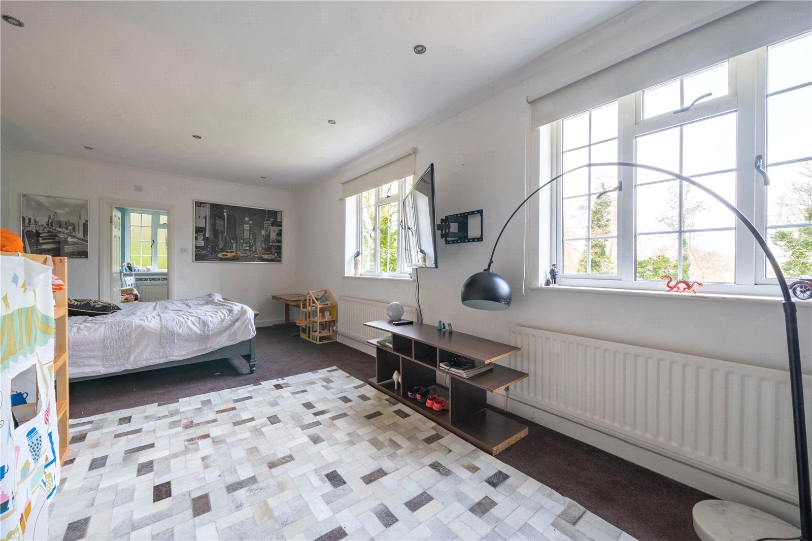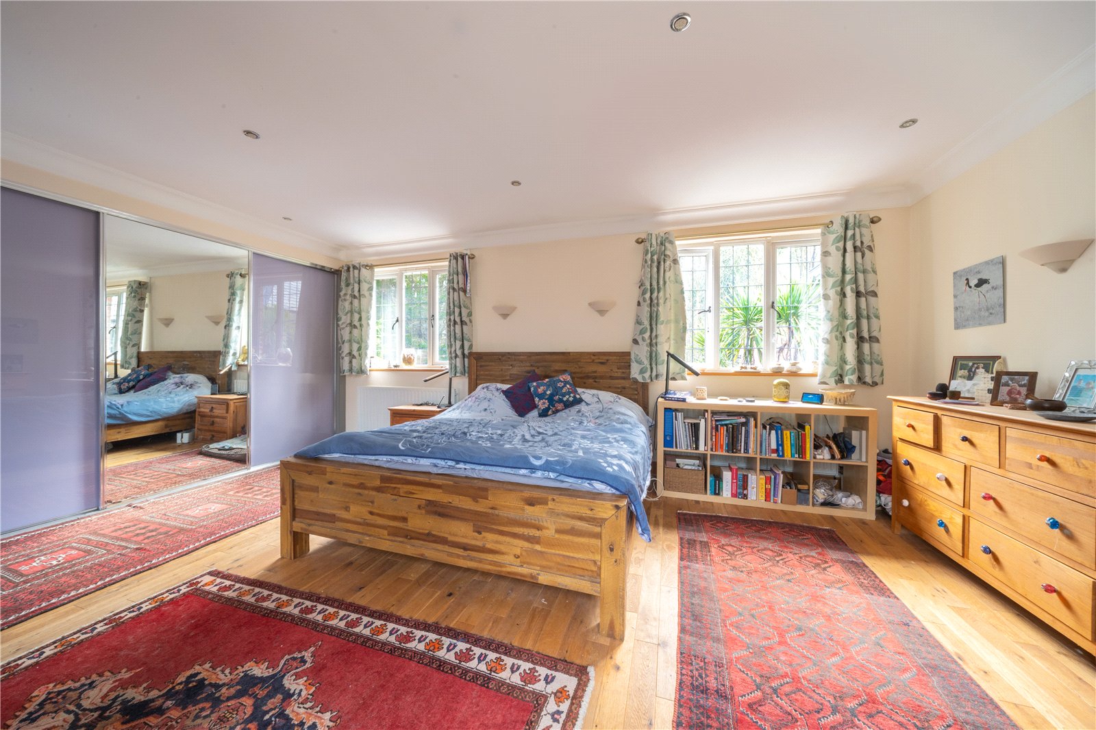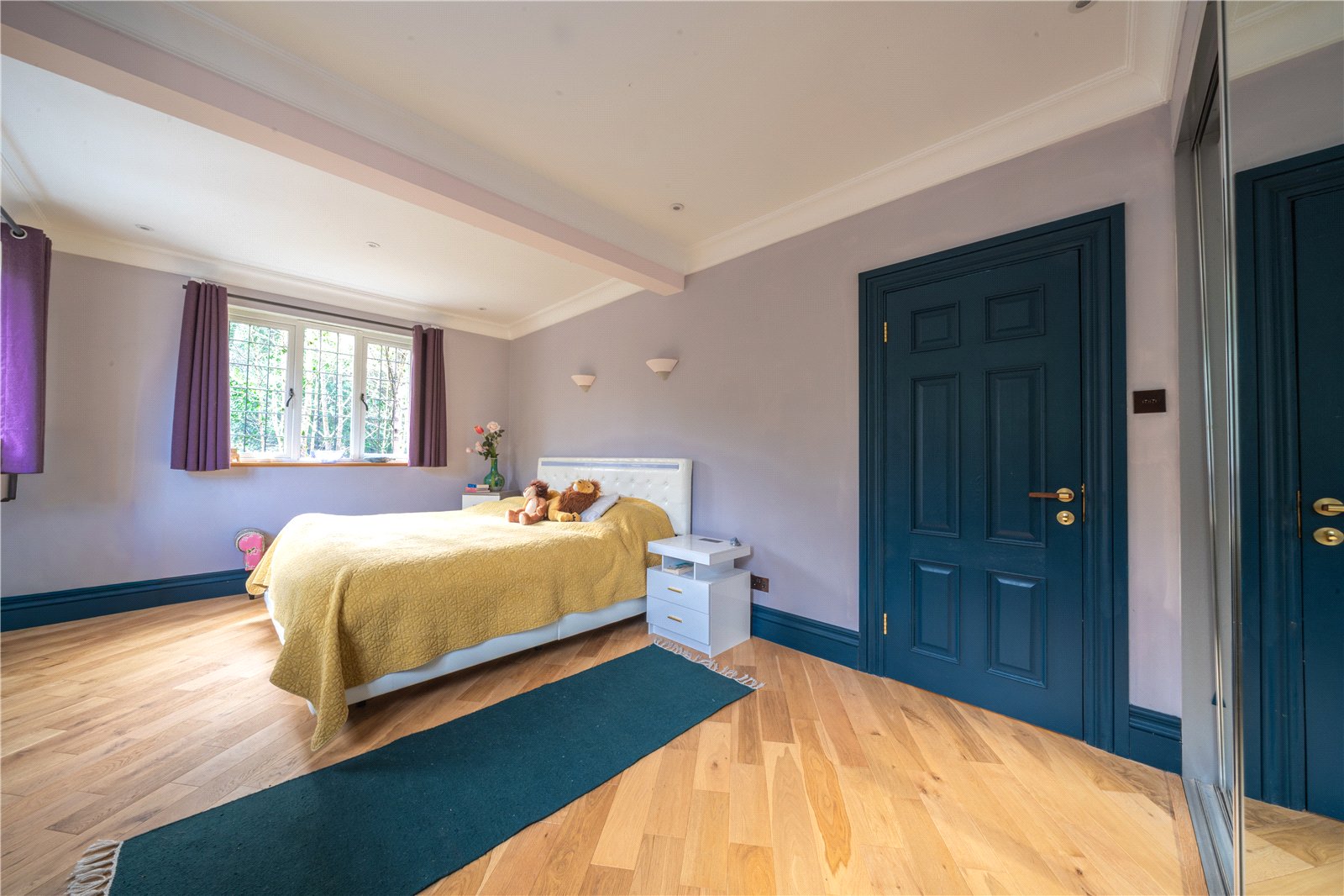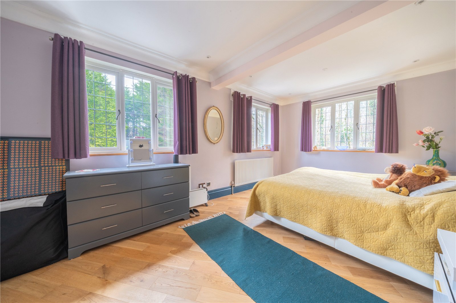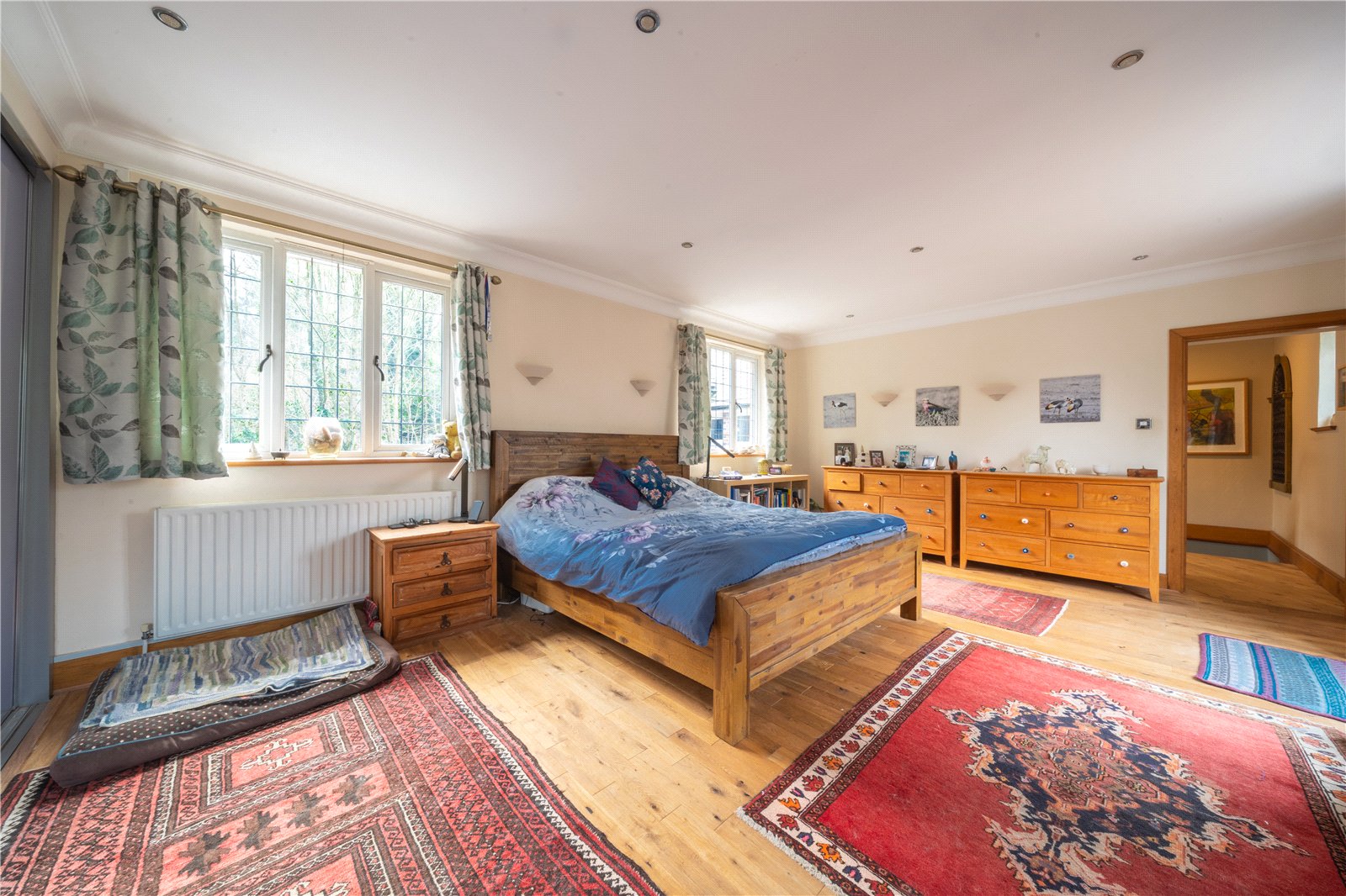 BEDROOM 7: This impressive bedroom is exceptionally spacious and beautifully light, benefitting from multiple windows that create a bright, airy atmosphere and provide attractive views over the surrounding greenery. The room is finished in soft, neutral tones and features quality wood flooring throughout, complemented by recessed ceiling lighting. Generous proportions allow for a super-king bed alongside extensive freestanding furniture, with ample circulation space enhancing the overall sense of comfort. Well laid out and highly versatile, the bedroom offers a calm and elegant retreat, ideally suited to a high-quality family home.