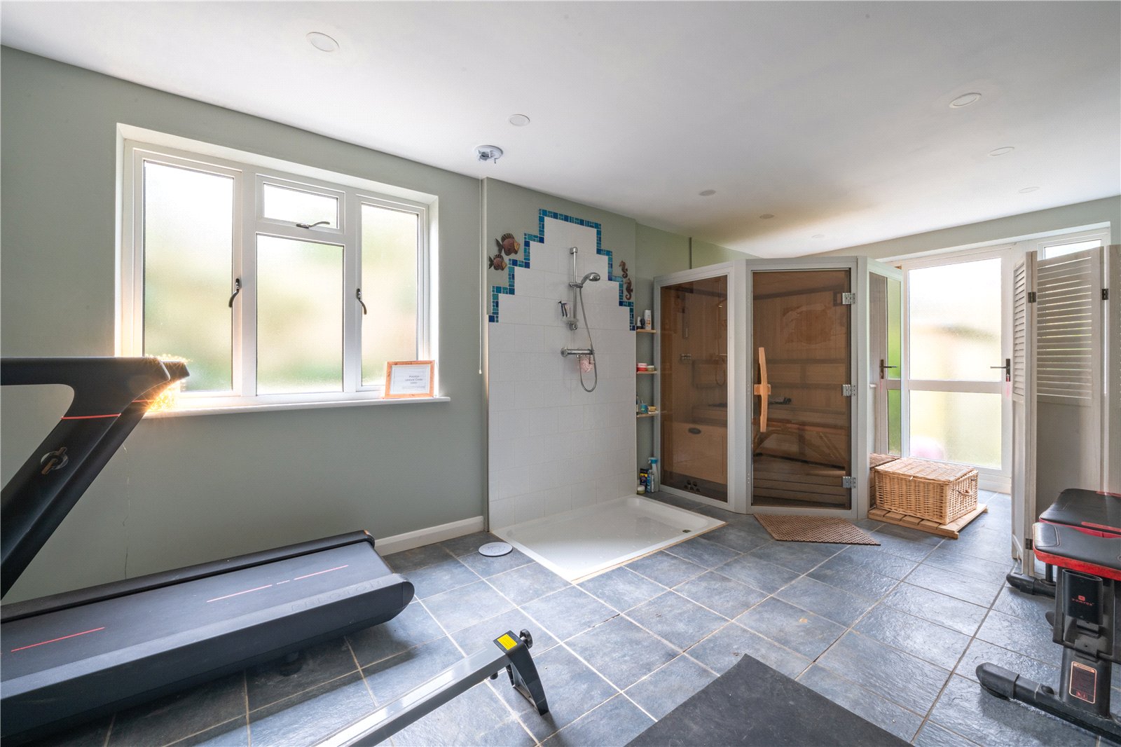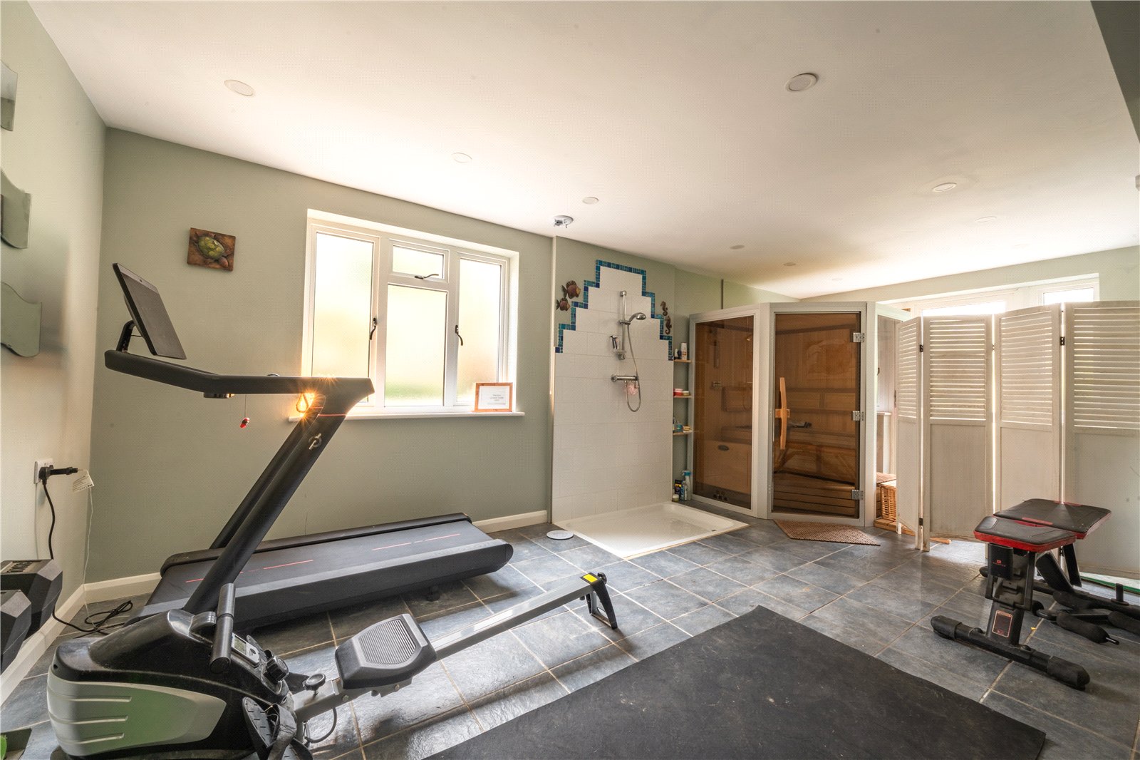 A dedicated sauna creates a private spa-like environment, complemented by a walk-in shower area, making the room ideal for both exercise and relaxation. The space benefits from durable tiled flooring, recessed ceiling lighting and windows that enhance ventilation and brightness throughout.