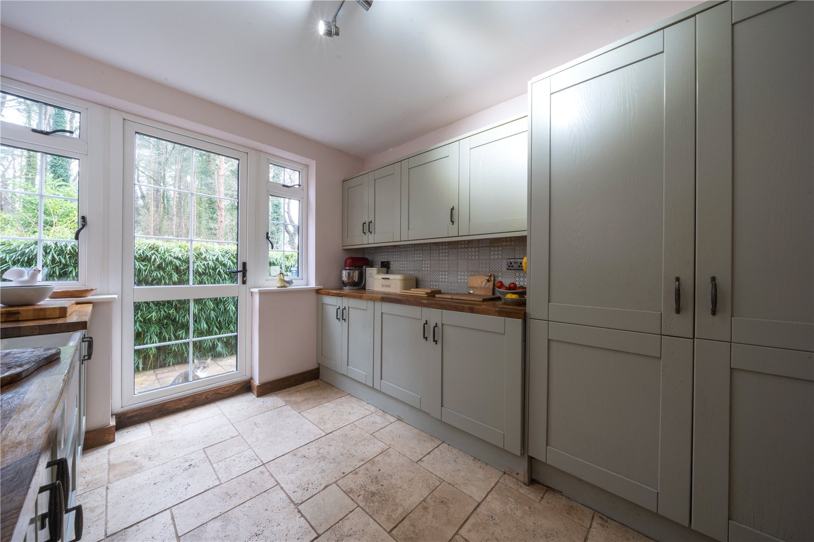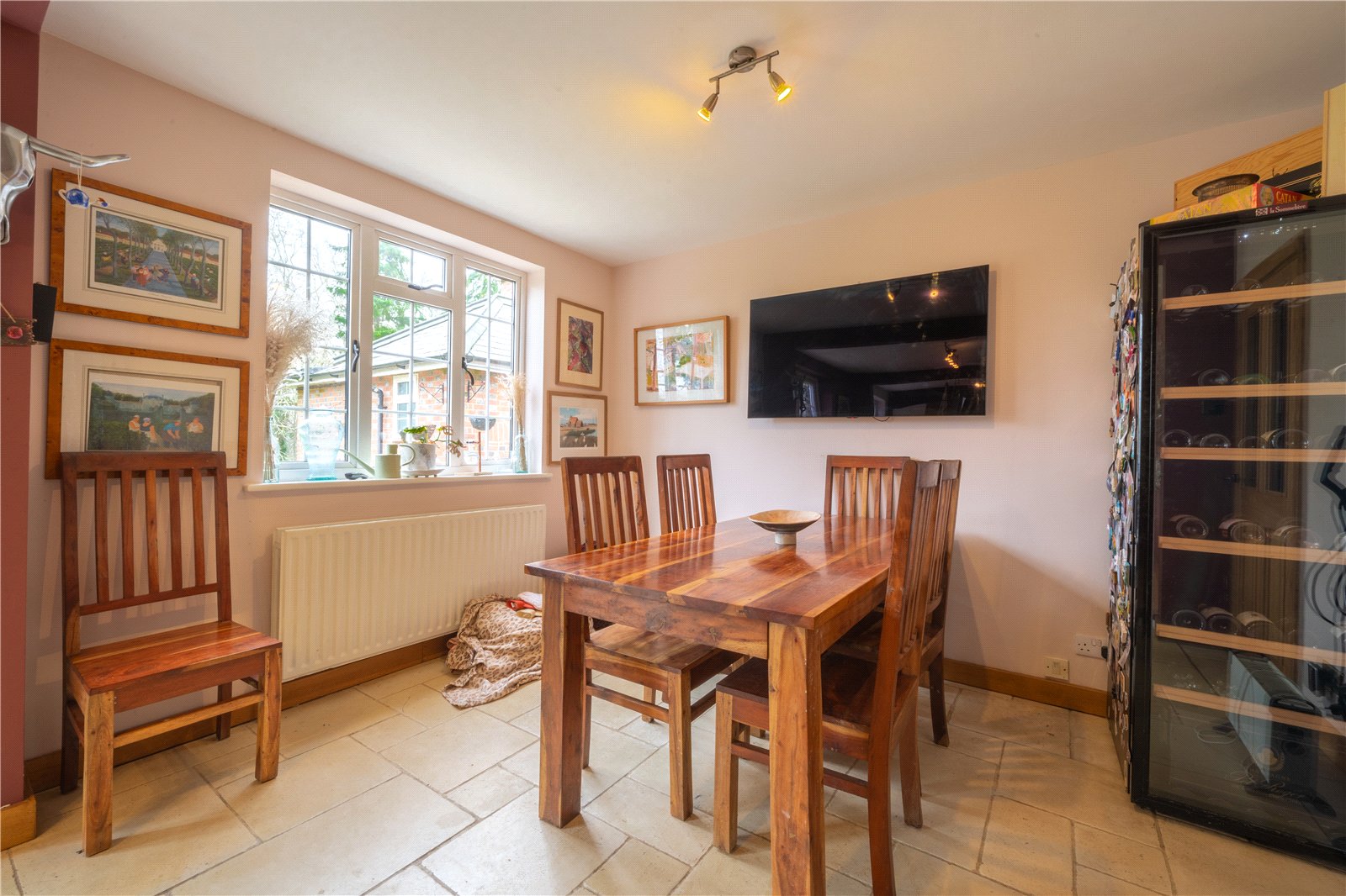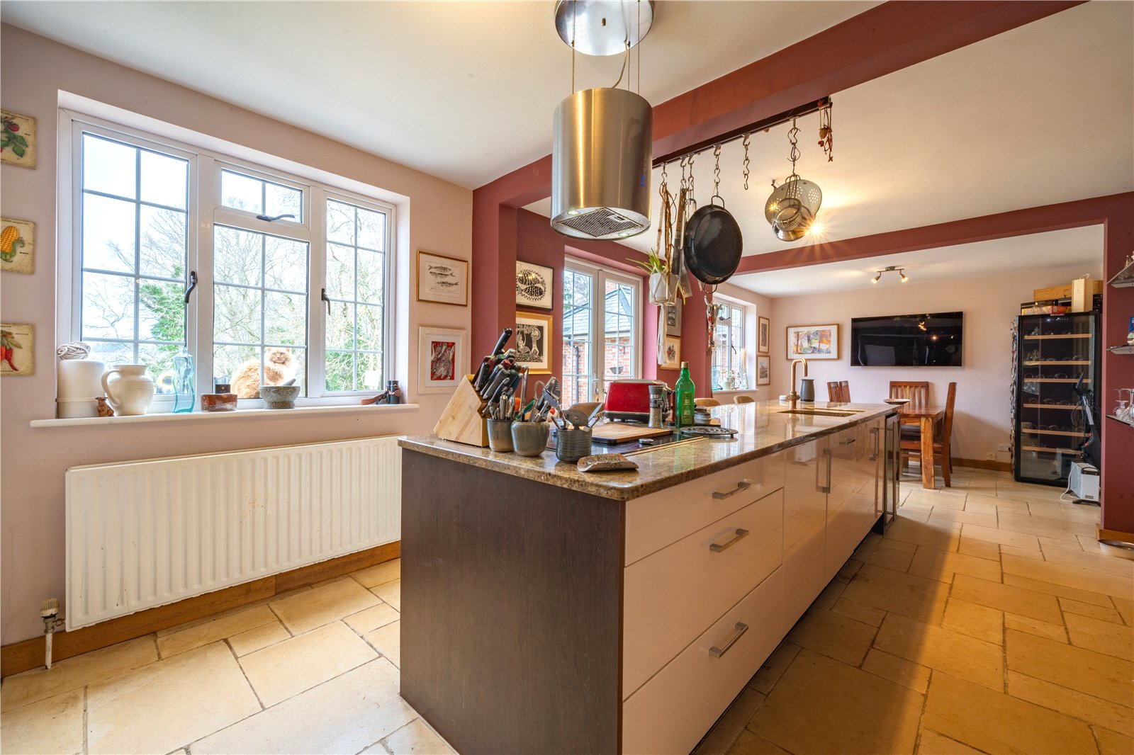The adjoining dining area comfortably accommodates a family-sized table and benefits from excellent natural light via multiple windows and glazed doors, which also offer a pleasant outlook and connection to the outside. Stone flooring runs throughout, adding character, durability and continuity across the space.