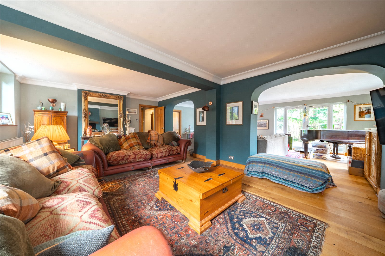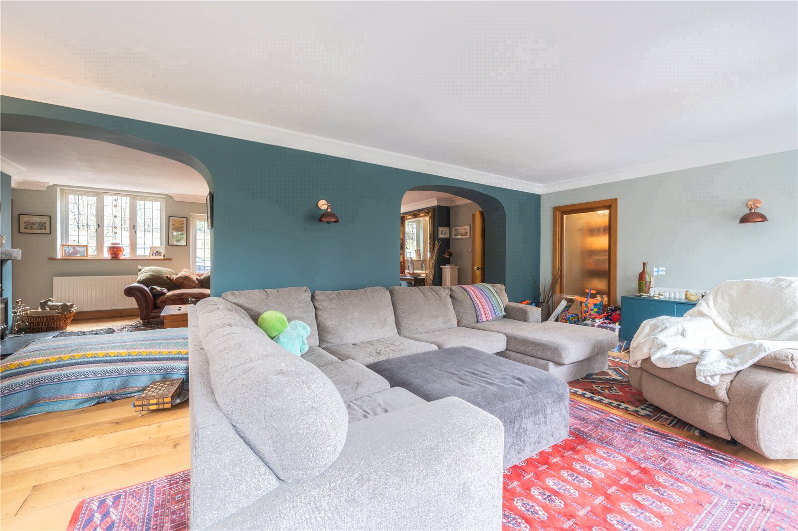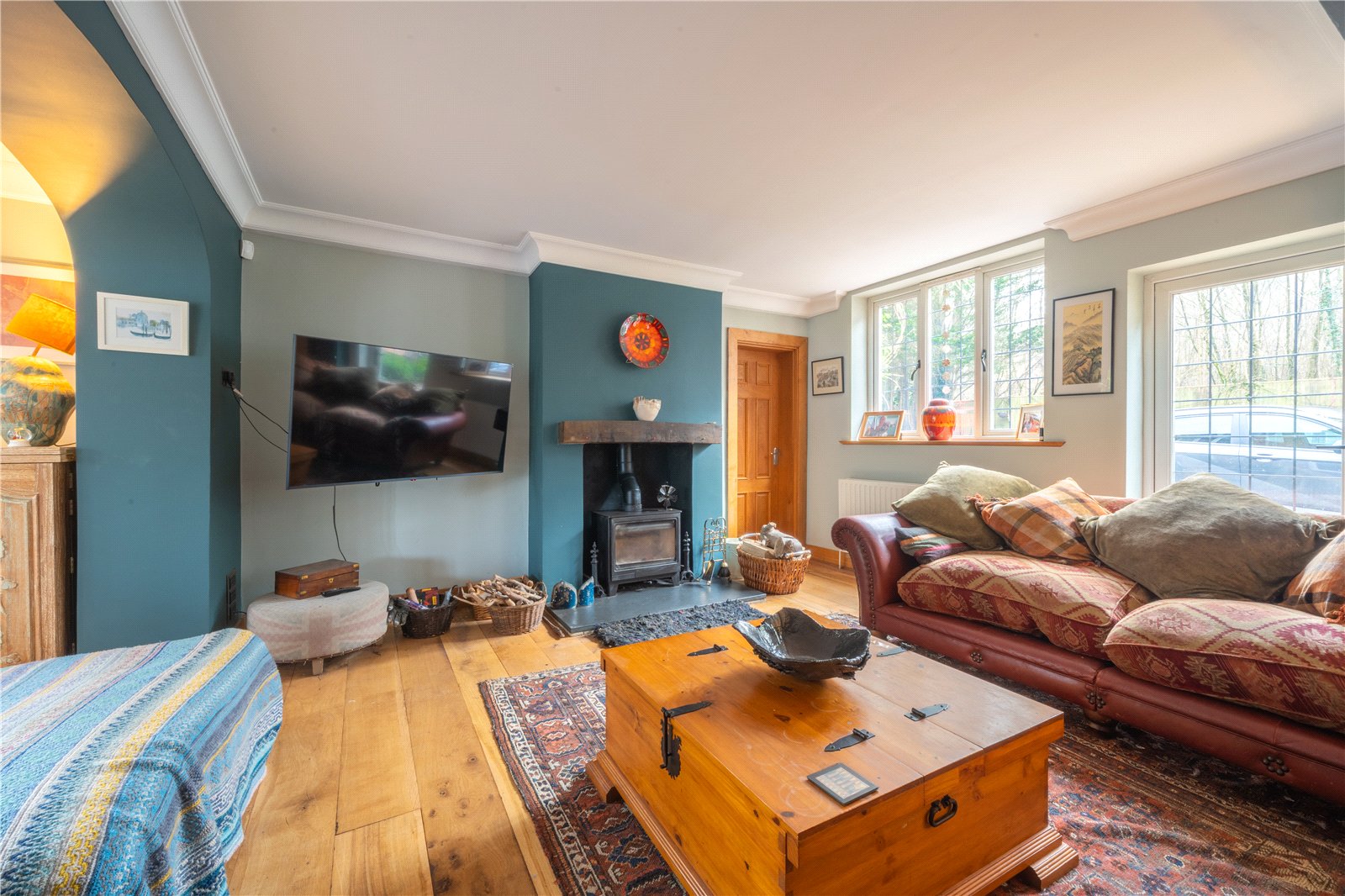Character features include attractive arched openings that subtly divide the space into defined yet flowing zones, allowing for separate seating and relaxation areas. A wood-burning stove set within a feature fireplace adds warmth and focal interest, while wood flooring runs throughout, enhancing the room’s sense of quality and continuity.