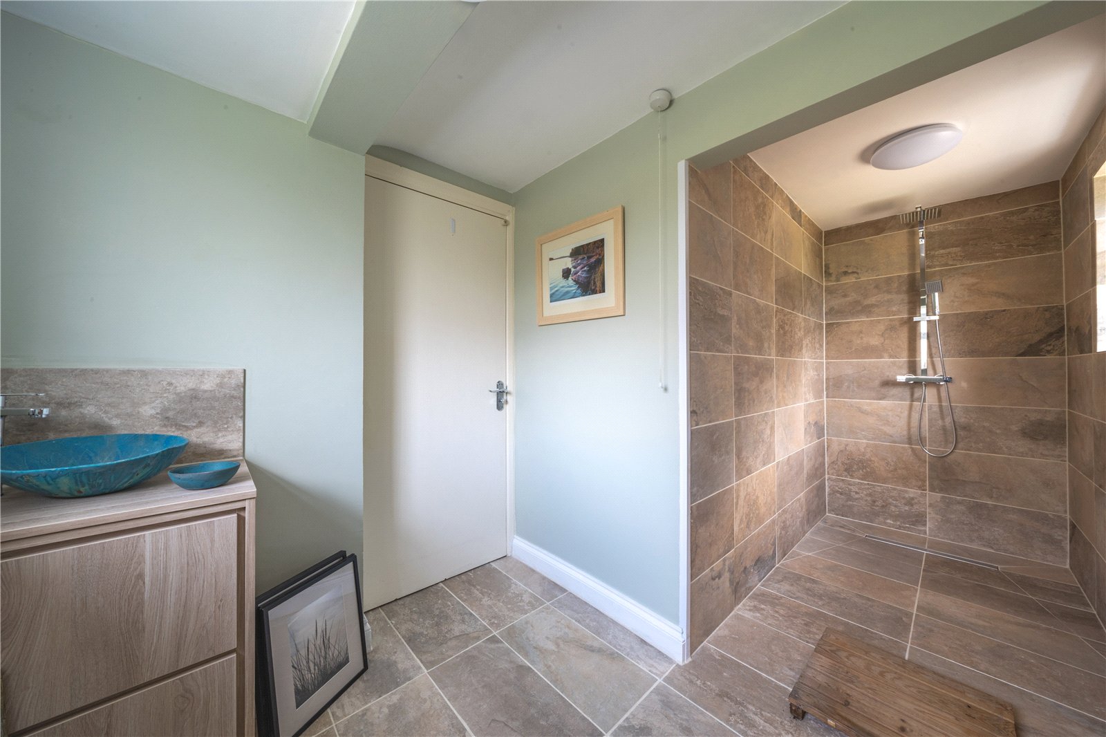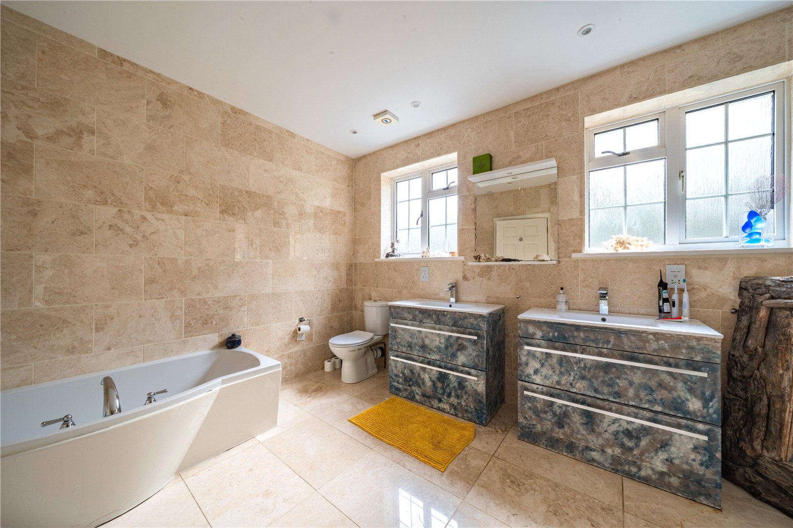 FAMILY BATHROOM: The family bathroom is exceptionally spacious and finished to a high standard, creating a luxurious and spa-like environment. Fully tiled in natural stone, the room enjoys excellent natural light from multiple windows, enhancing the sense of space and quality throughout. The suite features a freestanding bath, a large walk-in shower with glass screen and rainfall shower head, twin vanity units with contemporary basins, and a WC. Additional highlights include recessed ceiling lighting, a roof hatch providing further natural light and ventilation, and ample storage. Beautifully presented and thoughtfully designed, this impressive bathroom serves as a standout feature of the home.