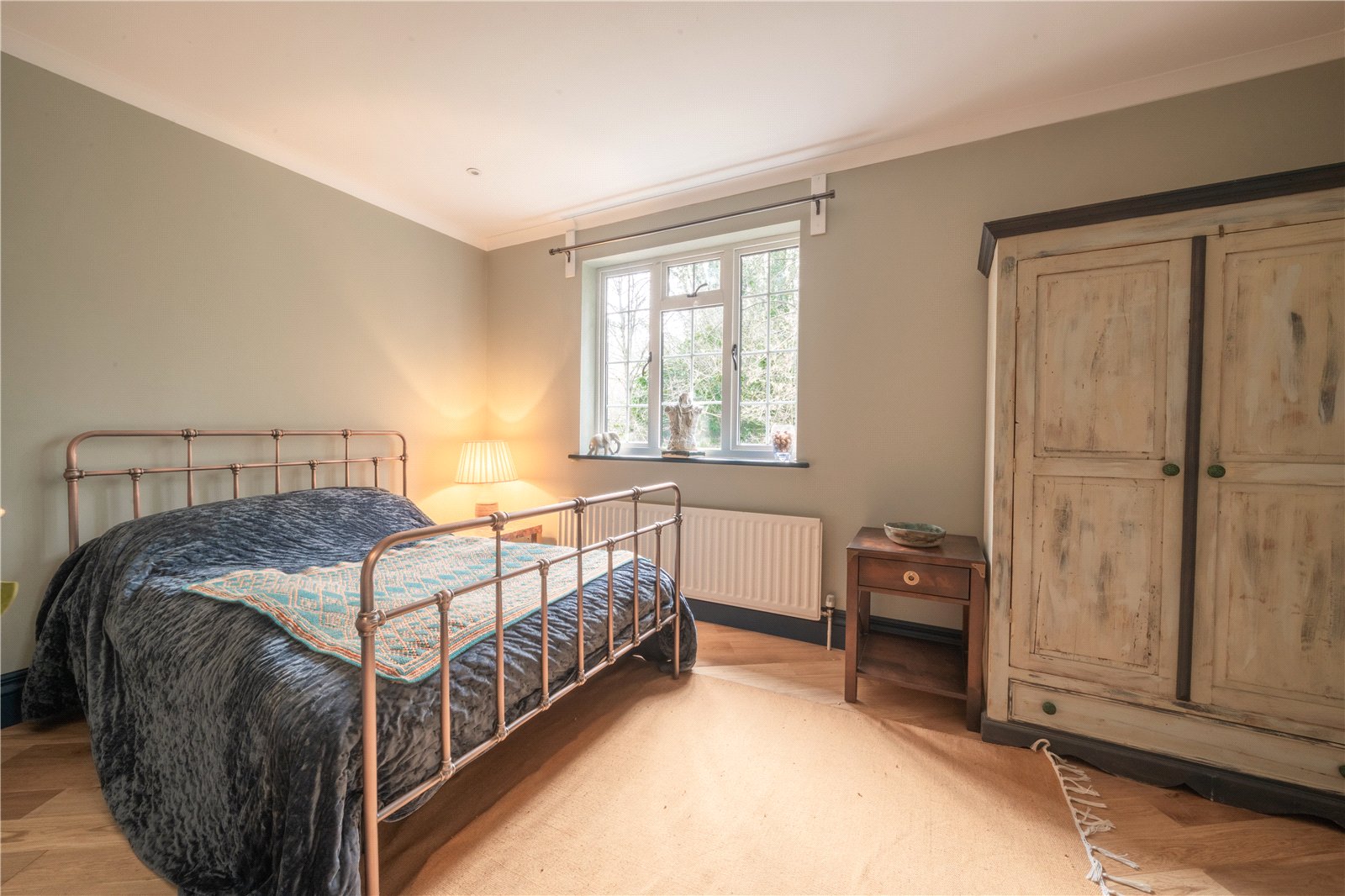 BEDROOM 4: This spacious and well-appointed bedroom enjoys a bright and welcoming atmosphere, benefitting from multiple windows that allow plentiful natural light and views over the surrounding greenery. The room is attractively presented in soft, contemporary tones and features quality wood flooring, adding warmth and character. Generous proportions comfortably accommodate a double bed and a full range of bedroom furniture, while the layout lends itself equally well as a principal bedroom or a comfortable guest suite. Calm, light-filled and well finished, this bedroom offers an excellent balance of space and practicality.