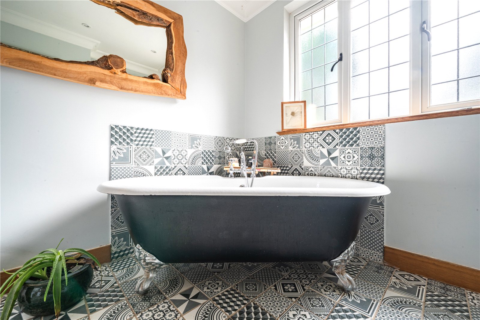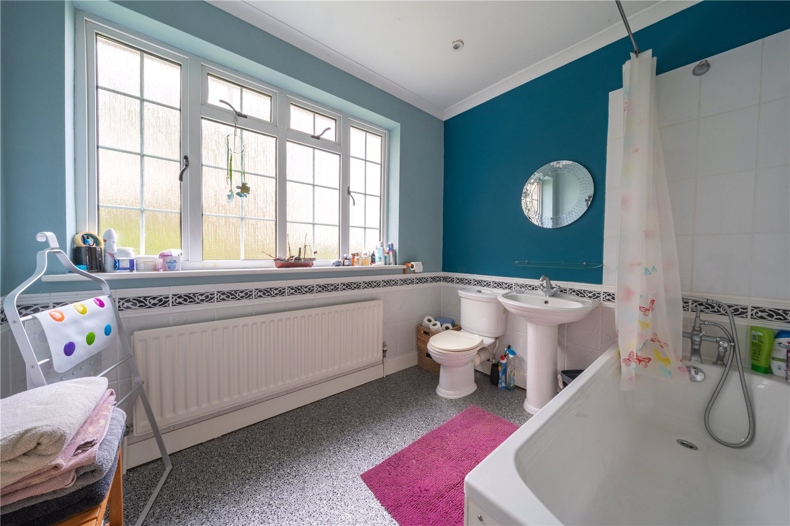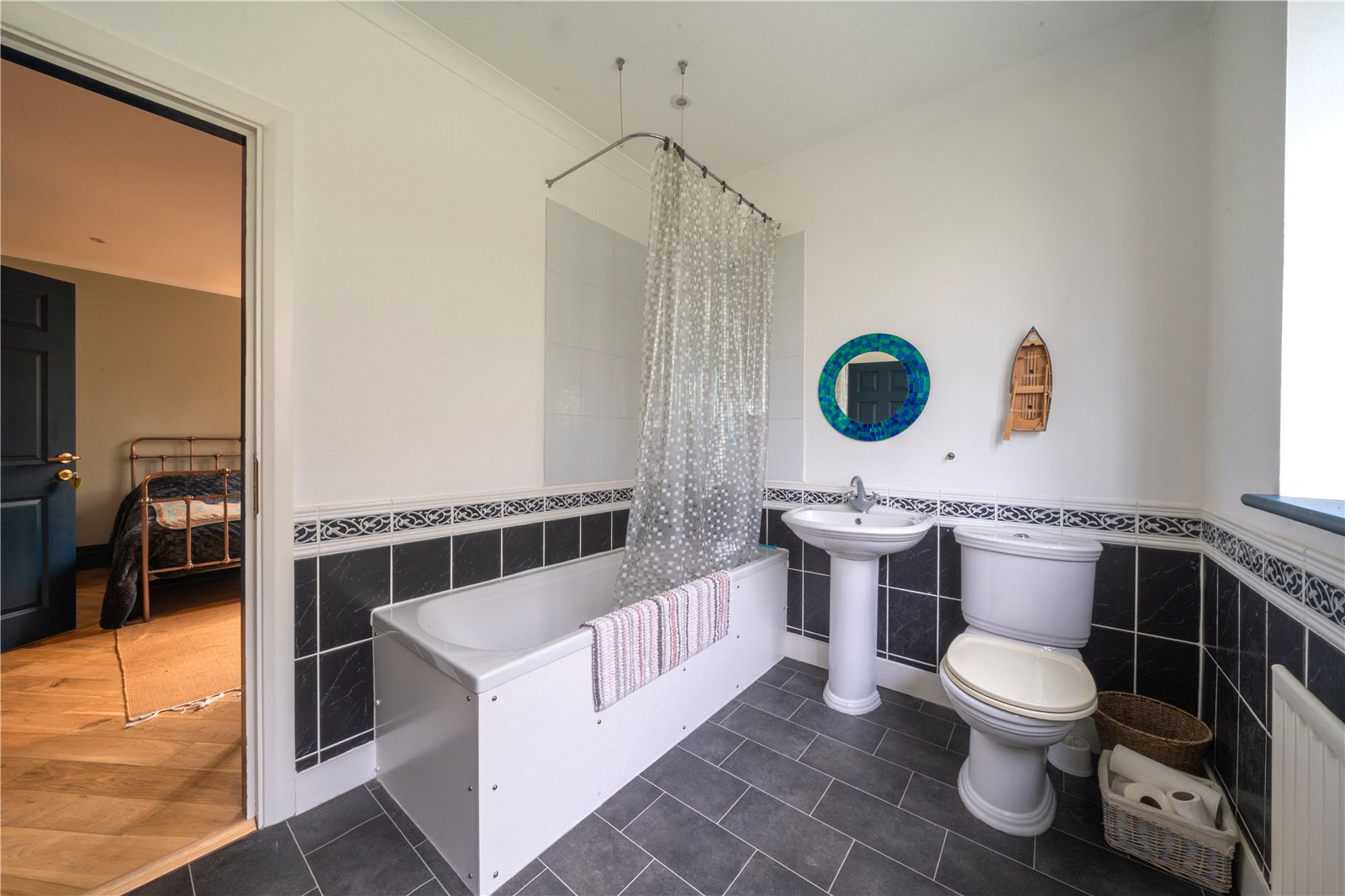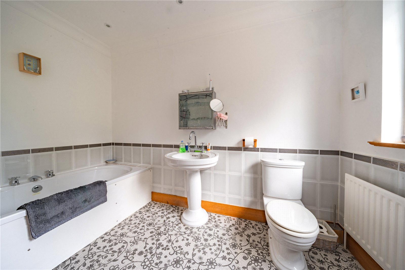 EN-SUITE: The en-suite bathroom is generously proportioned and filled with natural light from a wide, multi-pane window, creating a bright and airy feel throughout. Finished in a clean, contemporary style, the suite comprises a full-size panelled bath with shower attachment, pedestal wash basin and WC. Tiling to dado height is complemented by a bold feature wall, adding colour and character, while the space is completed with a heated towel rail and practical flooring. Well laid out and functional, the en-suite offers excellent scope for modernisation while remaining perfectly serviceable in its current form.