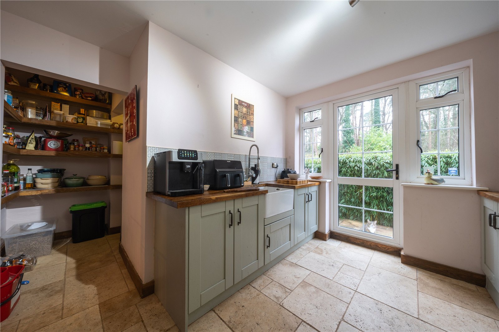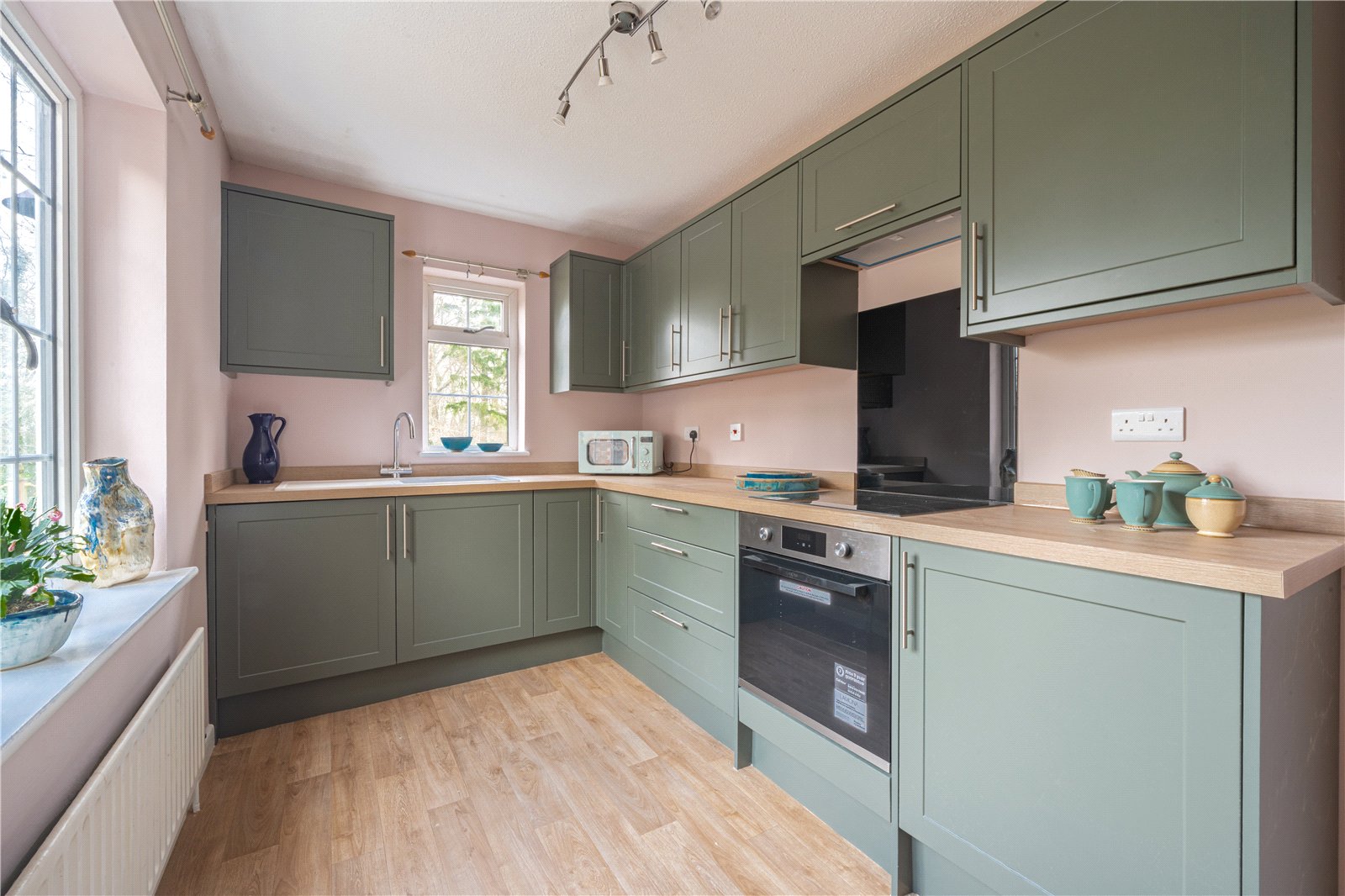 ANNEXE KITCHEN: This smartly appointed annexe kitchen is finished to a high standard and thoughtfully designed to maximise both storage and workspace. Fitted with a range of contemporary shaker-style units in a soft green tone, the kitchen is complemented by timber-effect work surfaces and integrated appliances, including an oven and hob. The layout provides excellent practicality for day-to-day use, while large windows allow plenty of natural light and offer pleasant views over the surrounding countryside.
