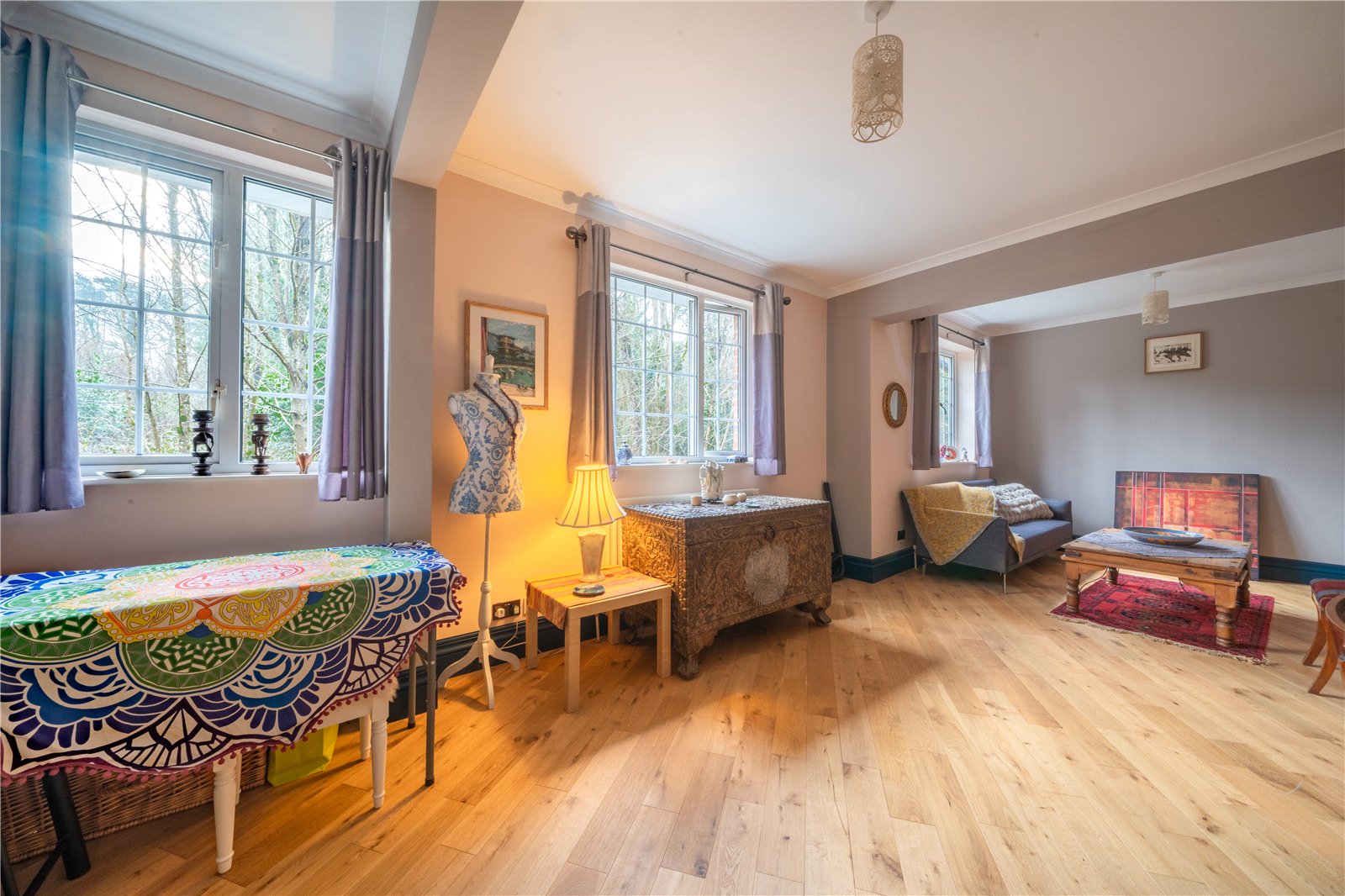 BEDROOM 3: This generous bedroom is bright and versatile, benefitting from multiple windows that draw in an abundance of natural light and offer pleasant views over the surrounding greenery. Finished in soft, neutral tones, the room features attractive wood flooring and a well-balanced layout that comfortably accommodates bedroom furniture alongside additional seating or workspace if desired. The proportions and configuration make this an ideal principal or guest bedroom, offering a calm and flexible living space well suited to both everyday use and occasional visitors.