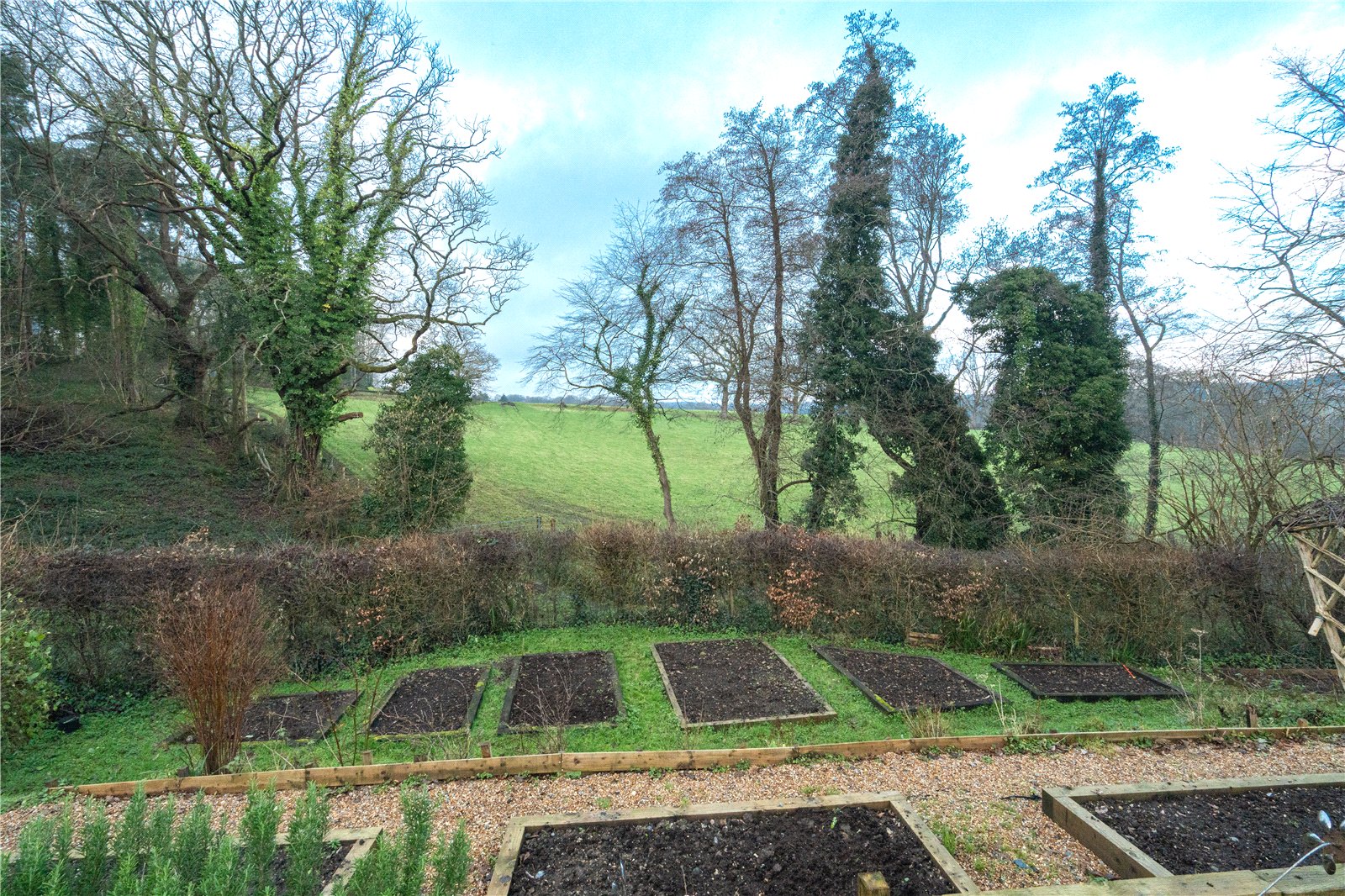 A substantial raised decked terrace spans the rear of the house, providing an ideal space for outdoor dining and entertaining while enjoying the open aspect over the gardens. The grounds are well arranged with a variety of seating areas, vegetable beds and planted borders, making the space both attractive and practical for family life. To the rear, the gardens open out to uninterrupted views over rolling fields, enhancing the sense of escape and tranquillity.