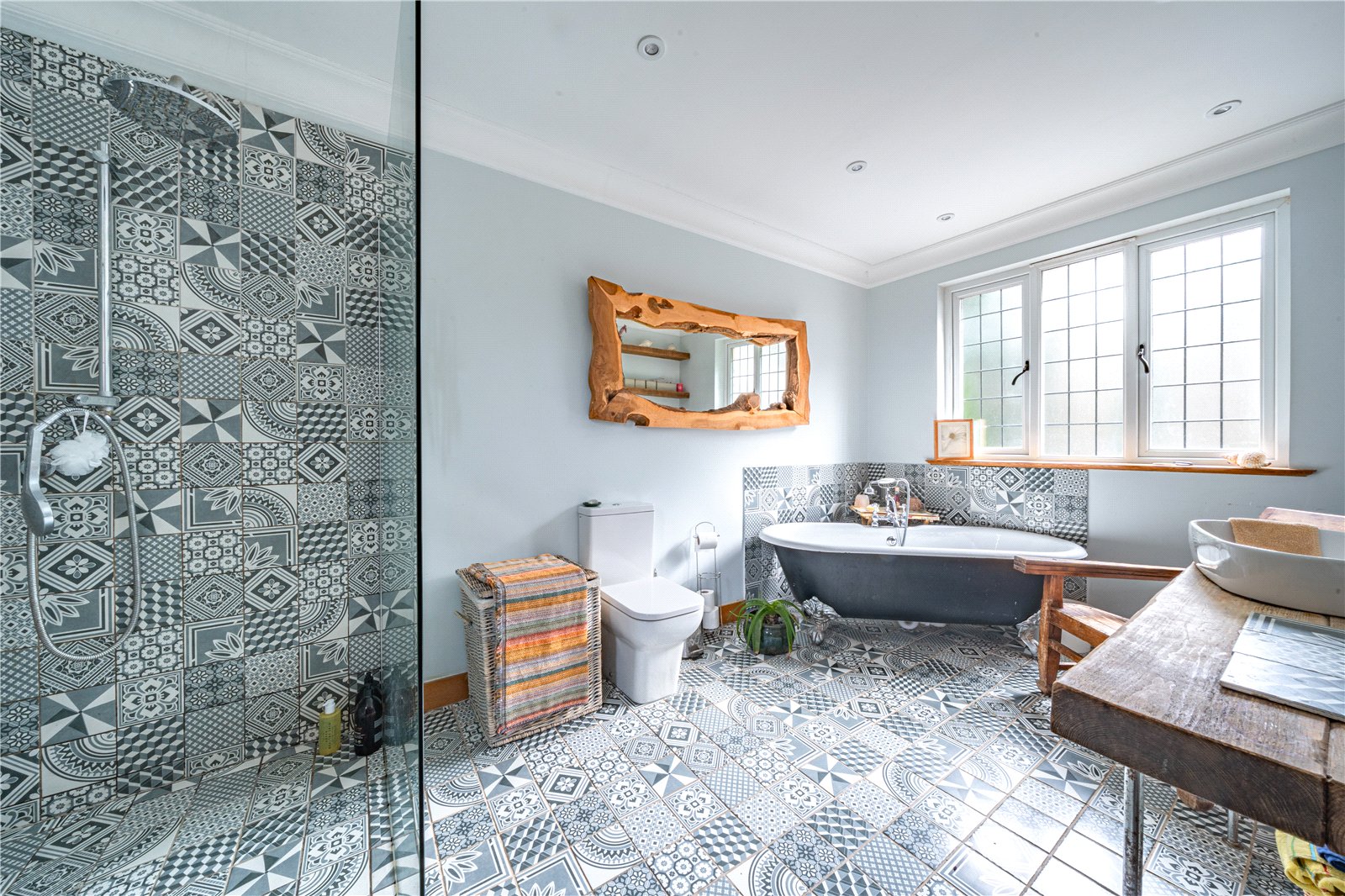 EN-SUITE: This striking en-suite bathroom is beautifully finished and offers a luxurious, contemporary feel. The room features a freestanding roll-top bath, a large walk-in rainfall shower with glass screen, and a WC, all complemented by distinctive patterned tiling that adds texture and character. Natural light is provided by a window, enhancing the bright and airy atmosphere, while recessed ceiling lighting completes the space. Stylishly designed and thoughtfully arranged, this impressive en-suite serves as a high-quality private bathroom, perfectly suited to a principal bedroom.