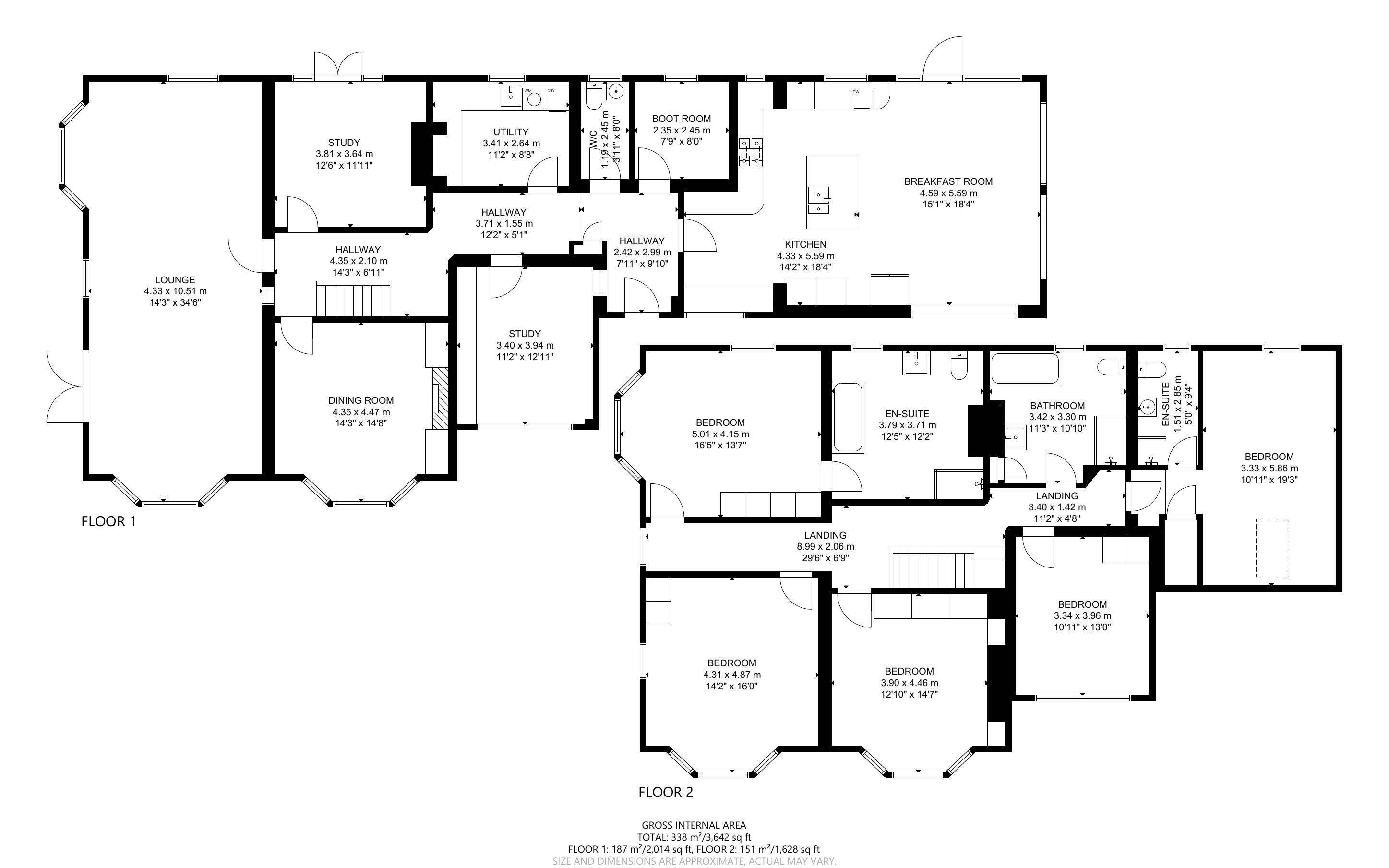 There are already two existing luxury ensuite, as well as a further luxury family bathroom / shower room, with the further possible option to incorporate a further ensuite shower room to bedroom three subject to planning if required. All of the five bedrooms are double in size and are accessed from the full-length landing, from which there is ample opportunity to access the large lofts / roof voids with a further staircase should a second-floor conversion be sought subject to planning.