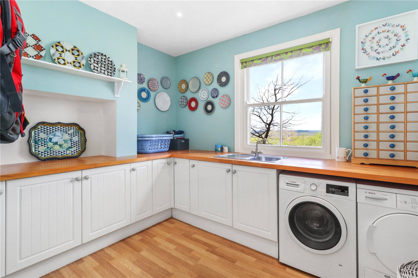 UTILITY ROOM: Approached from the main reception hall and comprising of a comprehensive range of cottage style base units with wooden worktops over, oak flooring, vintage styled radiator, fitted stainless steel sink unit with drainer and mixer tap, space for washing machine and space for dryer, down lights, coat hanging areas and window with aspect over the rear garden and of the beautiful far as the eye can see panoramic rural views.
