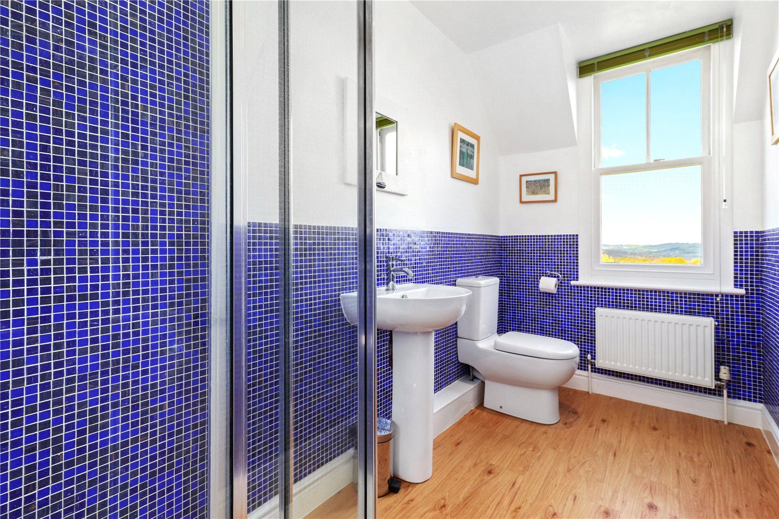 ENSUITE LUXURY SHOWER ROOM TO BEDROOM TWO: Comprising of oak effect floors, heavy glazed and chrome corner shower with shower control system, decorative glass tiled walls, pedestal wash basin with chrome mixer tap, W.C. radiator, downlights, chrome heated towel rail, sash window with a splendid and probably unrivalled panoramic view as far as the eye can see over the adjoining Sussex countryside.