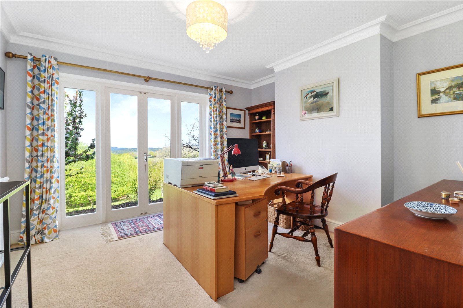 2ND STUDY / GAMES ROOM: Approached from the inner hall through a character part glazed and panelled wooden door. Comprising of a high-ceilinged room with coving, radiator, ceiling light, full height double glazed windows and matching French doors that open out onto the rear sun terrace and also benefiting from a stunning panoramic aspect of uninterrupted views as far as the eye can see of the beautiful undulating Sussex countryside, which believe to be possibly unrivalled.