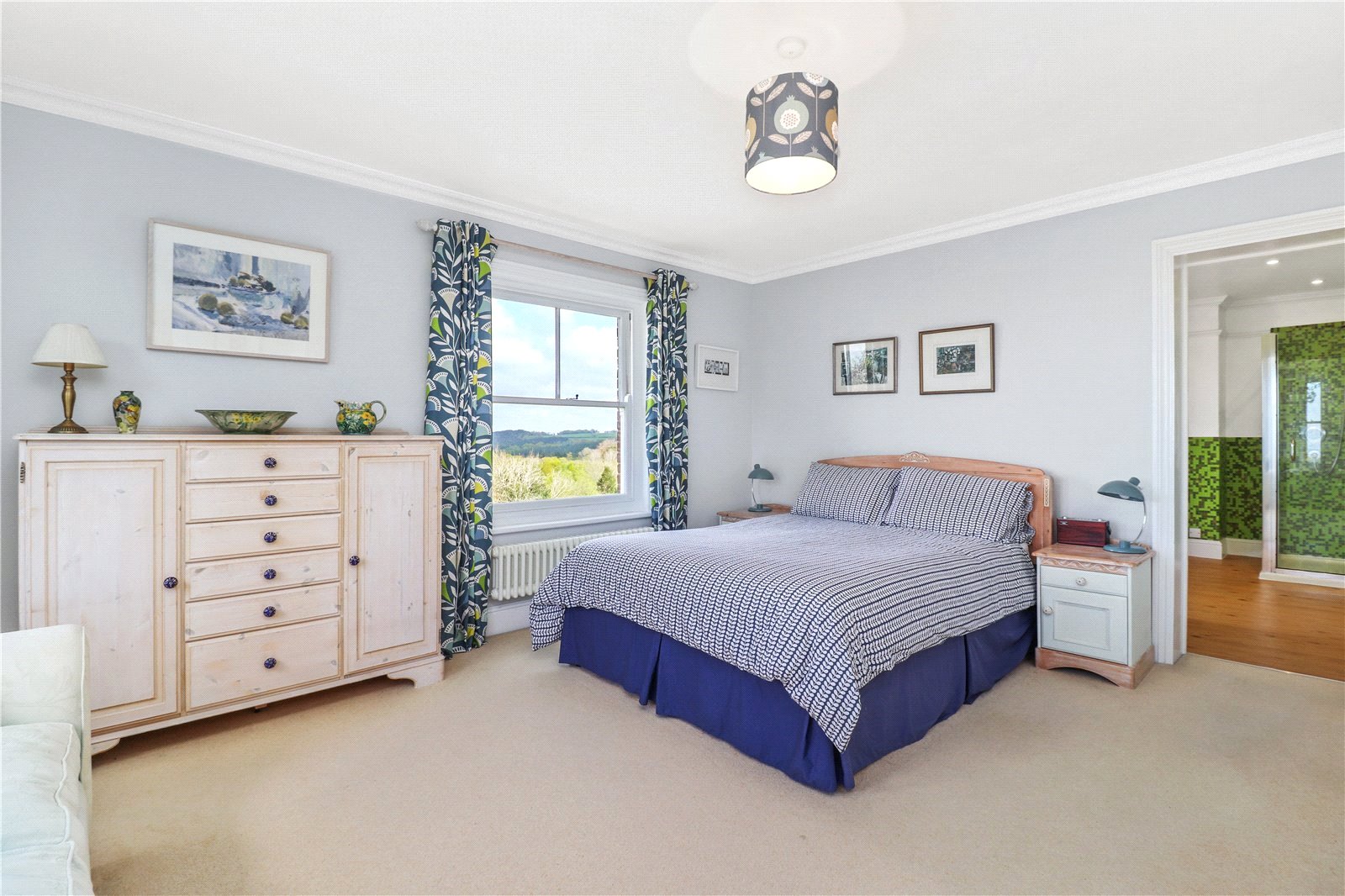 BEDROOM ONE MAIN SUITE WITH A LUXURY ENSUITE BATHROOM / SHOWER ROOM: Comprising of a double sixed double aspect room with coved ceilings, central light, vintage style radiator, fitted wardrobe cupboards, an impressive bay window enjoy a fabulous far reaching southerly aspect over the adjoining countryside as far as the eye can see and all the way to the South Downs, further large sash window with almost certainly unrivalled panoramic uninterrupted views literally as far as the eye can see over the undulating fields and woodland of Sussex. Door leading to the ensuite luxury bathroom / shower room.