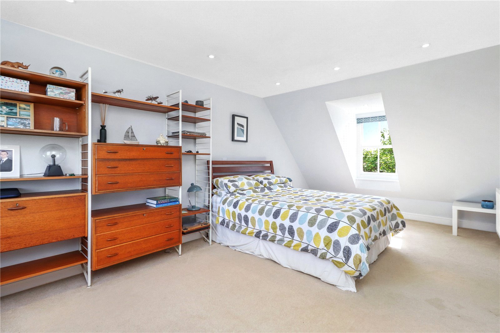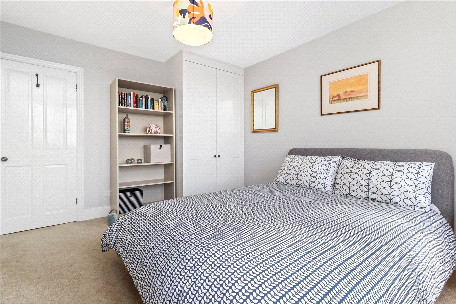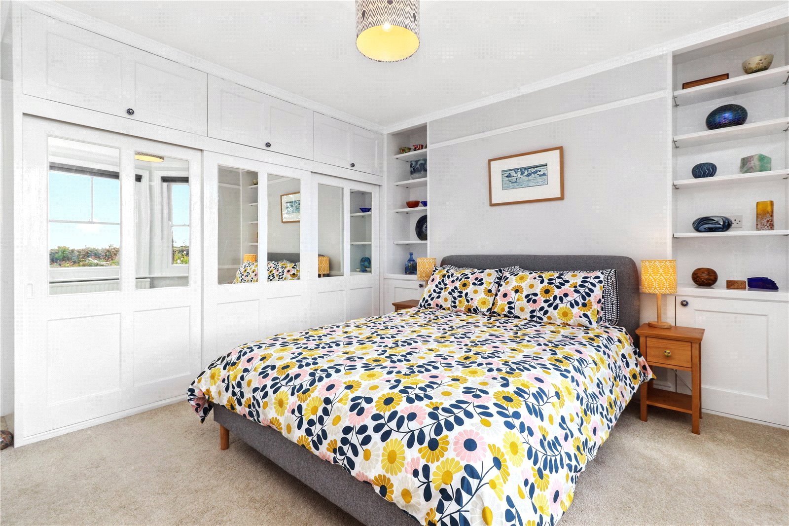 BEDROOM FOUR: A double sized room with fitted wardrobe cupboards, twin bespoke fitted display shelves with storage cupboards below, radiators, coved ceiling, dado rails, picture rails, ceiling light, large bay window enjoying a wonderful aspect over the front gardens and beyond of the Sussex countryside and all the way to the coast and sea on a clear day.