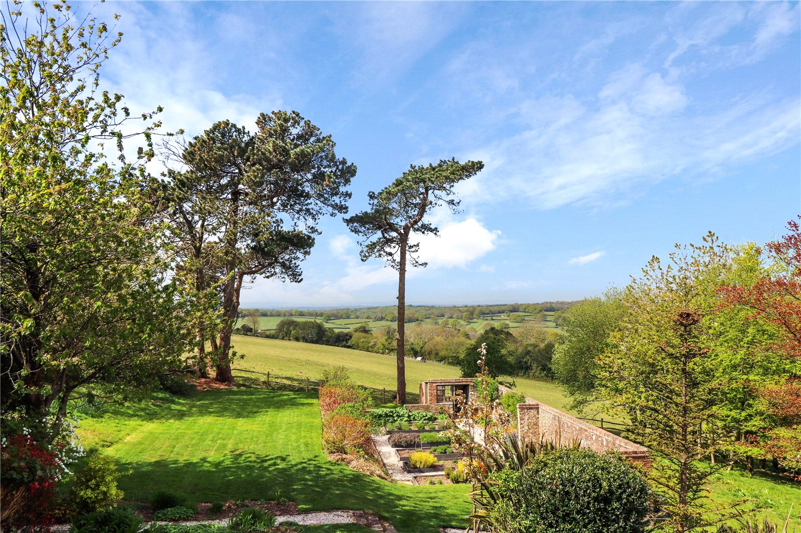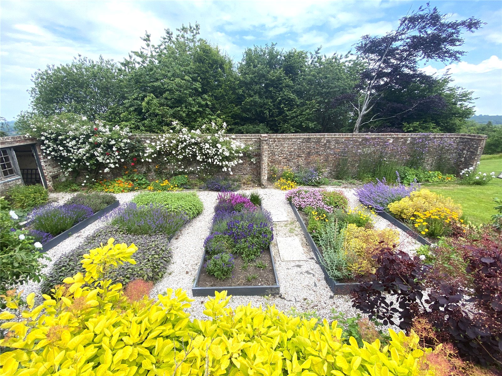 Beyond the sun terraces are further extensive lawned areas, a marvellous classically designed vegetable garden with an old rustic brick-built remnant of an old potting shed and greenhouse.