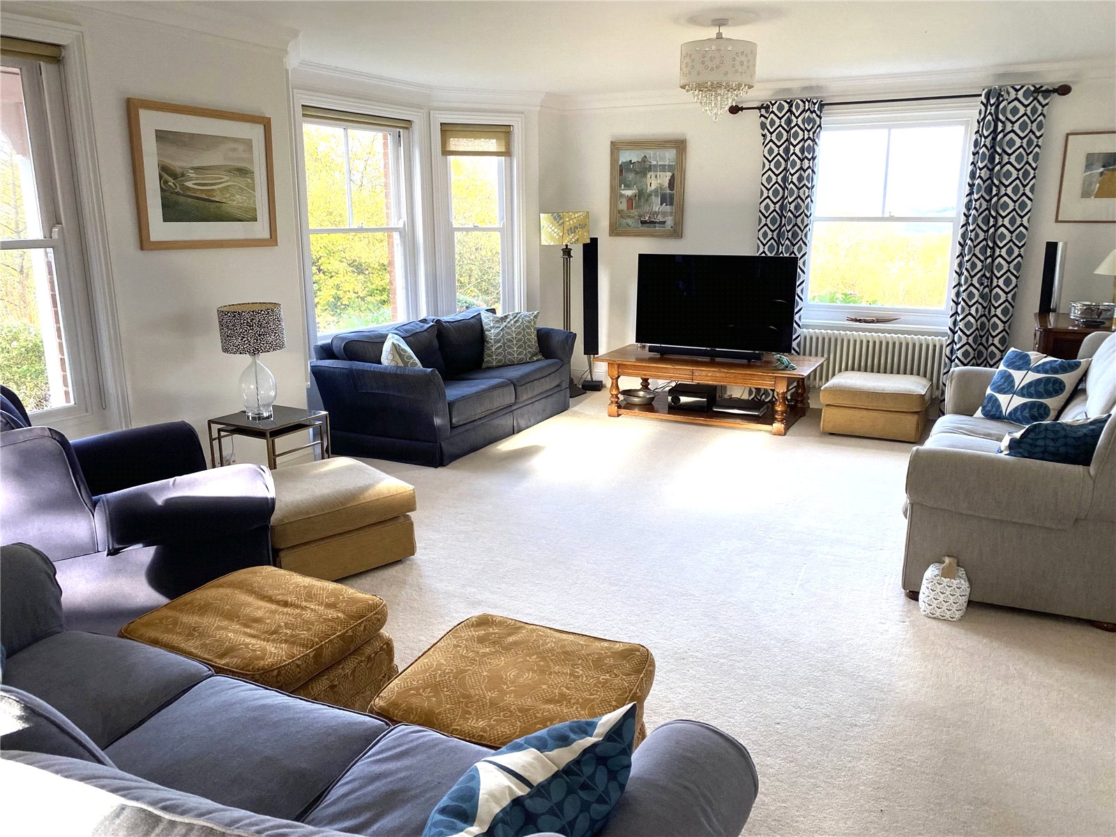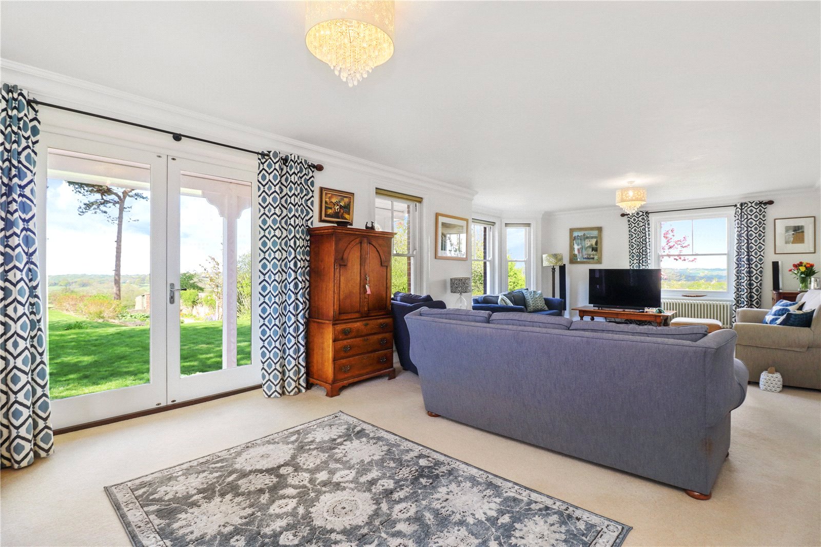 SITTING ROOM: Approached from the inner hall through a character part glazed and part panelled door. A large and impressive triple aspect room enjoying an abundance of natural light, as well as fabulous views. At each end of this substantial reception room are elegant bay windows, in addition to further sash windows and a pair of wooden and glazed French doors, which open out onto the side sun terrace that also has spectacular far reaching uninterrupted rural views all the way to the South Downs National Park, coved ceilings, vintage style radiators, ceiling lights, further large sash window with probably an unrivalled and most incredible panoramic uninterrupted rural view as far as the eye can see of undulating hills and woodlands.