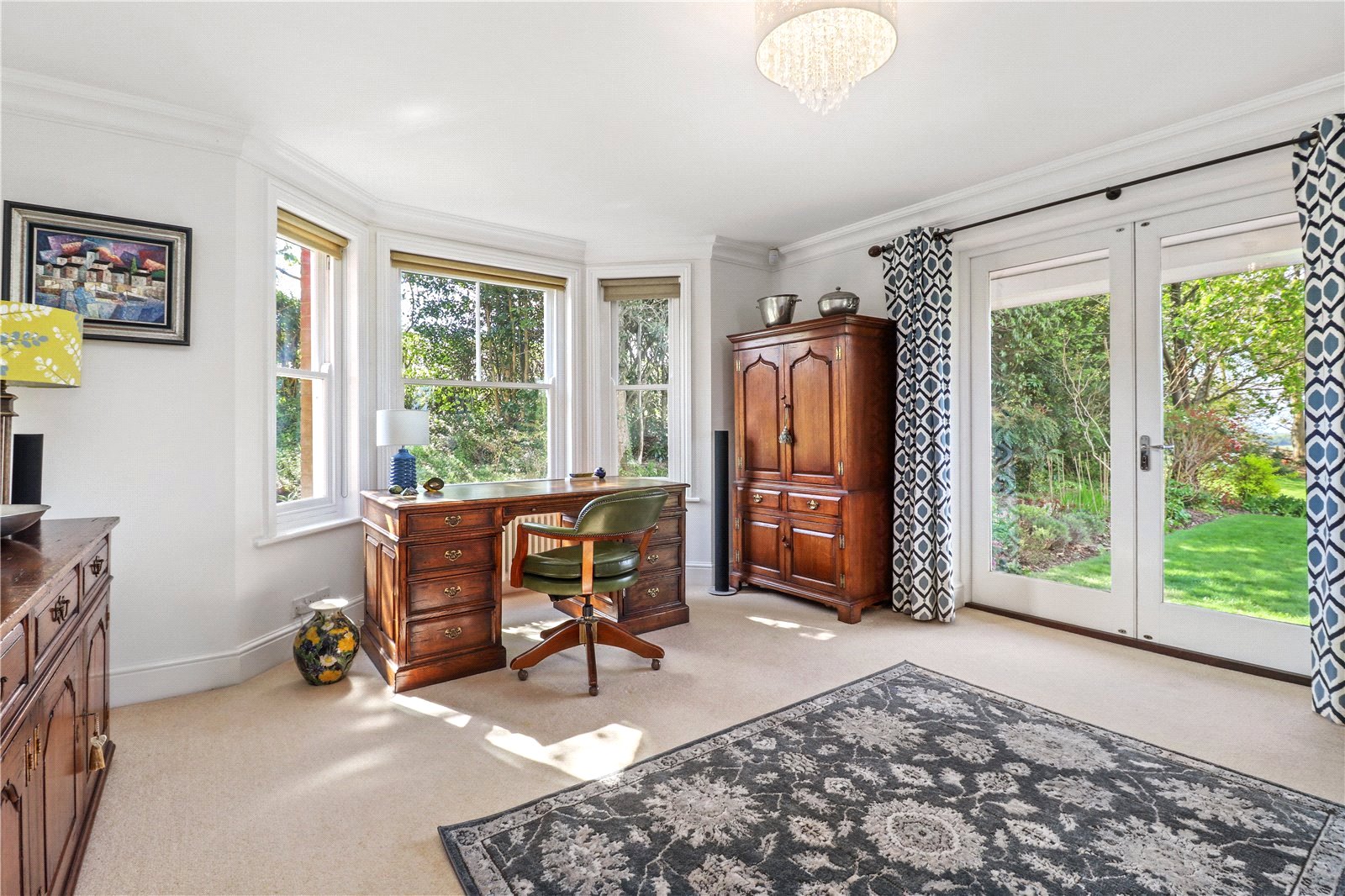 STUDY: Approached from the inner hall through a part glazed and panelled wooden character door, with an impressive bespoke fitted bookcase with filing sections and storage cupboards below, dado rails, picture rails, radiator and internal character paned window with aspect to reception hall, further sash windows with aspect over the front landscaped gardens.