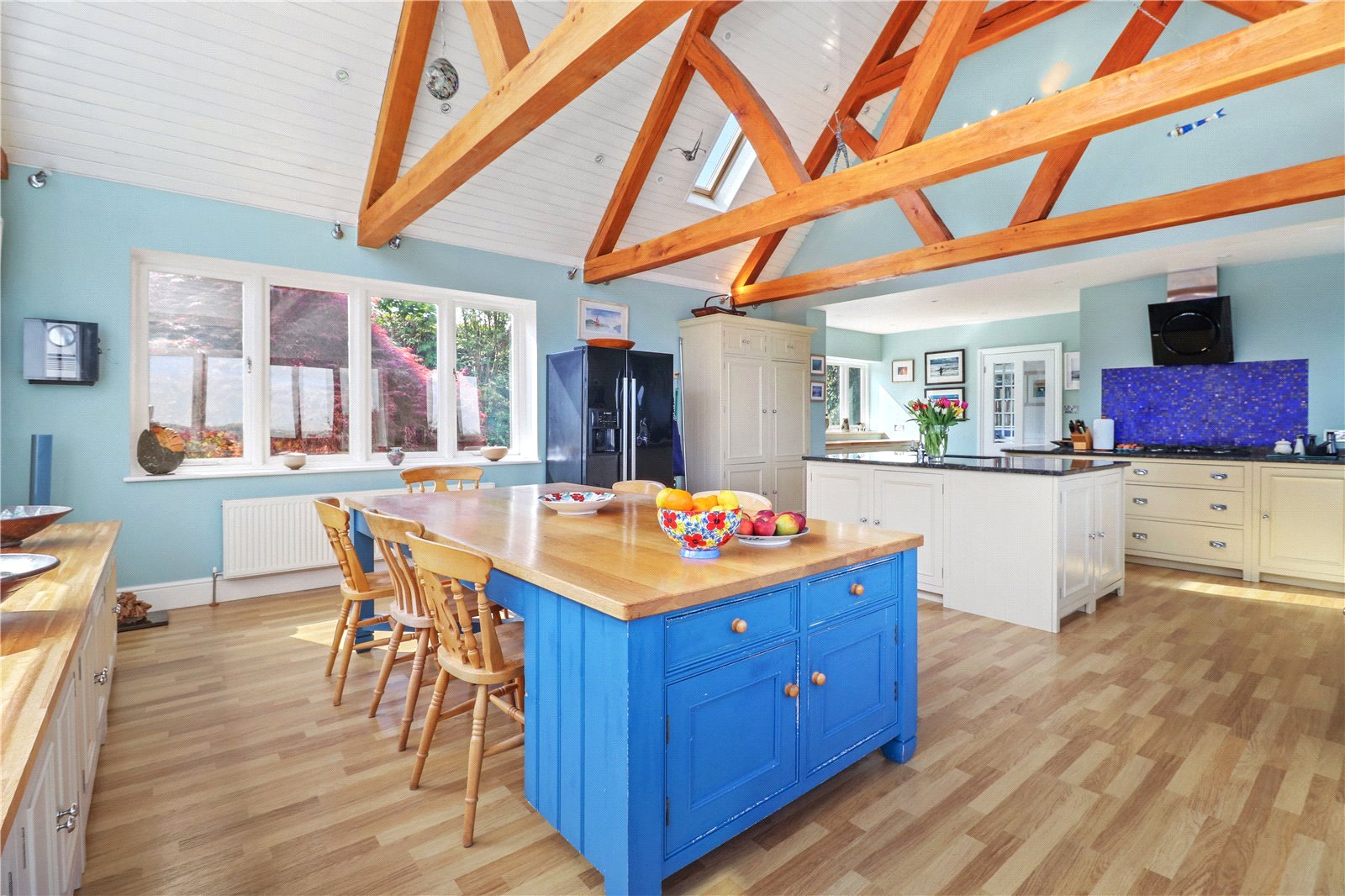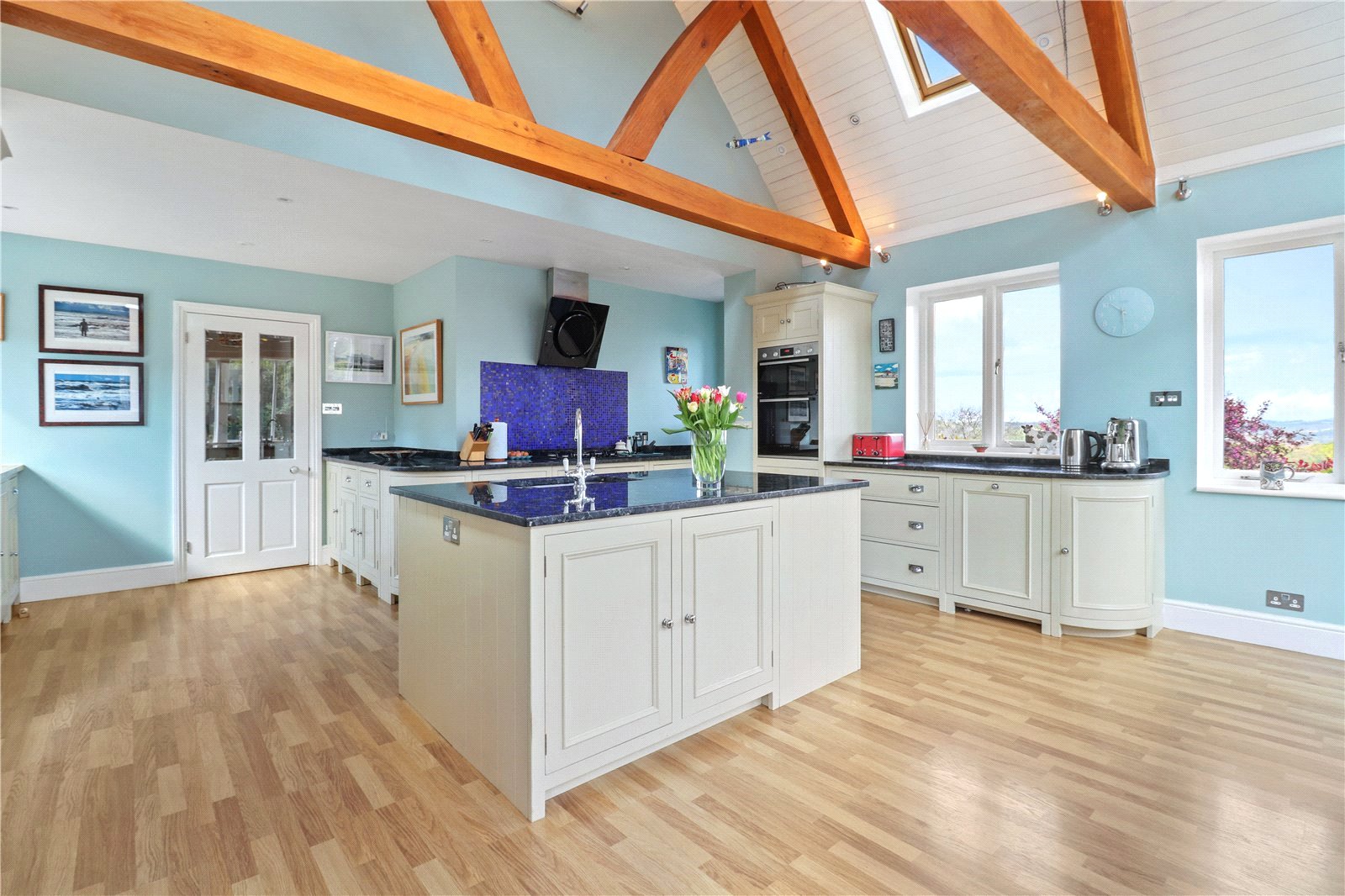 LUXURIOUS AND SUBSTANTIAL SIZED OPEN PLAN BESPOKE KITCHEN / BREAKFAST ROOM WITH OPEN PLAN GENERAL DINING ROOM AREA: With a spectacular vaulted ceiling and feature beams. The main kitchen area comprises of a splendid and comprehensive bespoke range of shaker style cupboard and base units with beautiful granite work tops over, fitted five ring gas hob with decorative tiled back plate, further granite splash backs, air purifier hood over, fitted glazed and brushed steel oven and grill, space for large American fridge freezer, integrated dishwasher, large central Island with matching bespoke units with further granite preparation top and breakfast bar area, inset twin sink unit with mixer tap, further side range of bespoke base units with wooden worktops over and window with aspect to front landscaped gardens, further windows with absolutely fabulous breath-taking panoramic far reaching uninterrupted rural views as far as the eye can see.