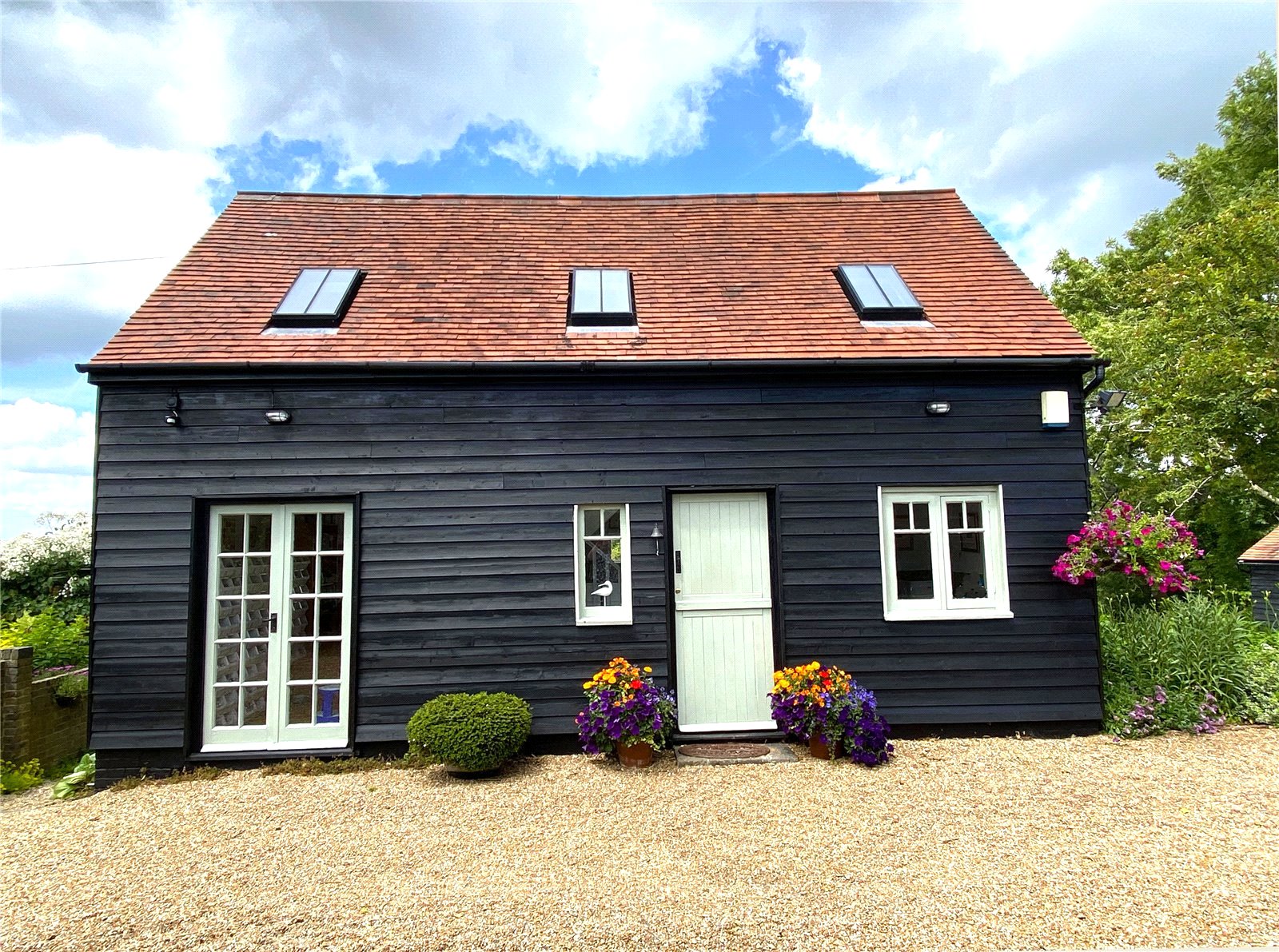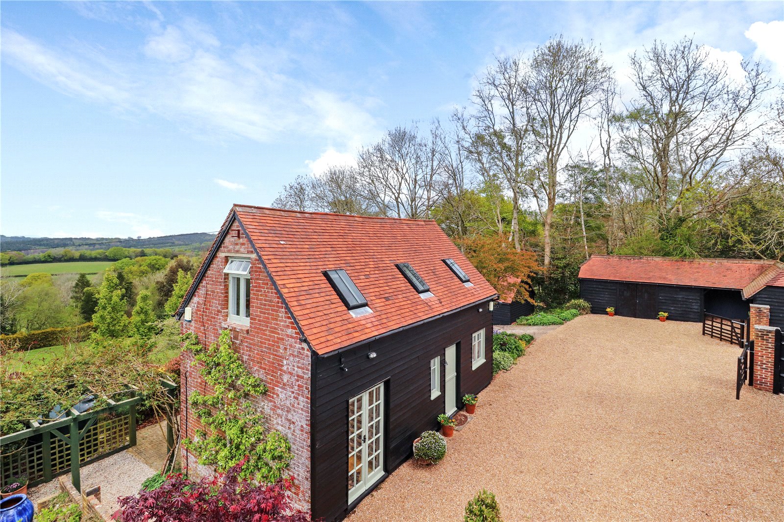 NORTHERLY FACING SIDE GARDEN: This area is predominantly occupied by two large Sussex style wooden slat boarded buildings currently used for storage, one of which was a stable complex. In front of these buildings are an extensive gravel driveway with further gravelled parking areas for a number of vehicles.