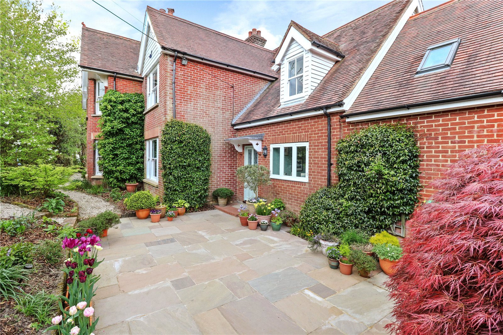 FRONT GARDENS: These are created with a design influence primarily for a visual appreciation with numerous well stocked flower and shrub borders, including also many specimen trees and varieties of highly scented plants. Furthermore, the are brick, paved and gravel walkways meandering through its various parts, including a fabulous arboreal gazebo.