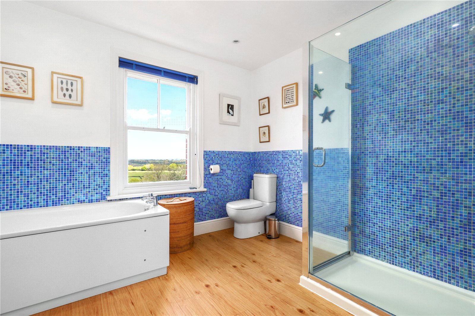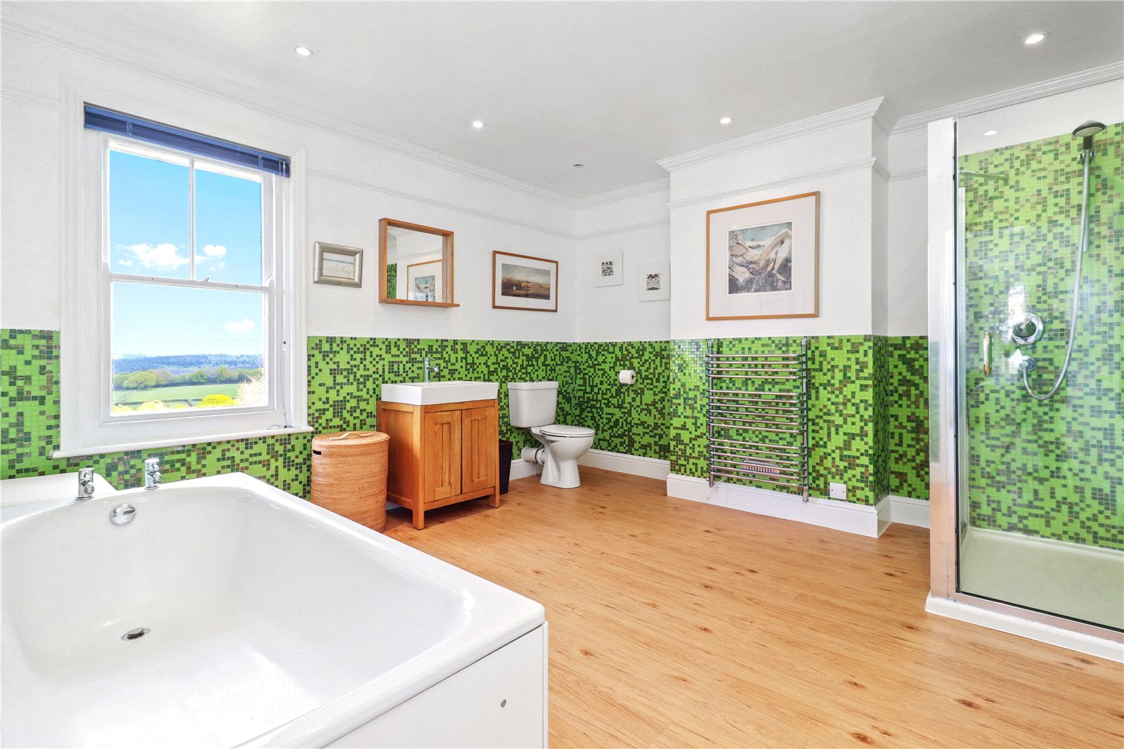FAMILY BATHROOM / SHOWER ROOM: Comprising of a fitted panelled bath with chrome taps, decorative glass tiled walls, chrome wall mounted heated towel rail, radiator, down lights, airing cupboard, W.C., separate heavy glazed and chrome sided corner shower with chrome shower control system, decorative glass tiled walls, oak styled floors, large sash window with a wonderful aspect over the rear grounds and beyond to the