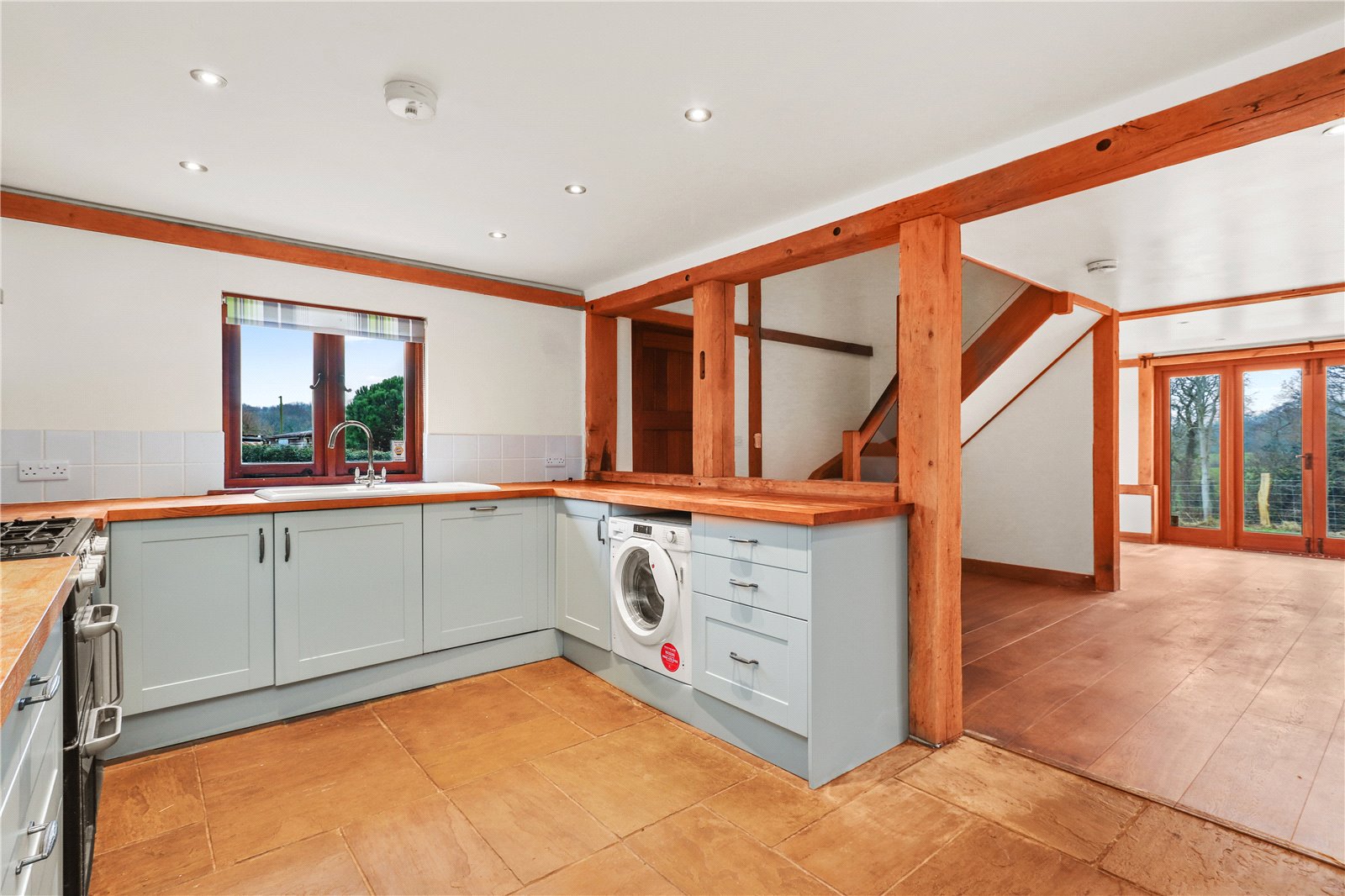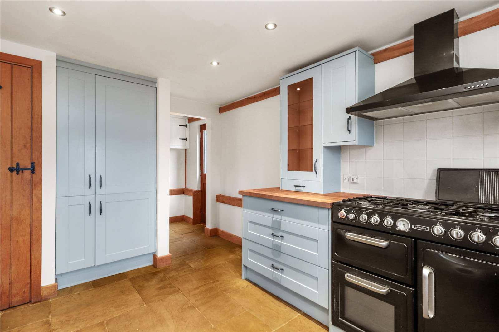 KITCHEN: With a lovely oak topped and oak beamed breakfast bar and preparation worktops, range of modern shaker style cupboard and base units with tiled surrounds, inset 1 ½ drainer sink unit with mixer tap, leisure gas cooking range, air purifier hood over, space for washer dryer, integrated dishwasher, display cabinets, integrated fridge freezer units, stone floor, downlights, double glazed window with aspect to front garden, further exposed oak beams, doorway leading to rear lobby.