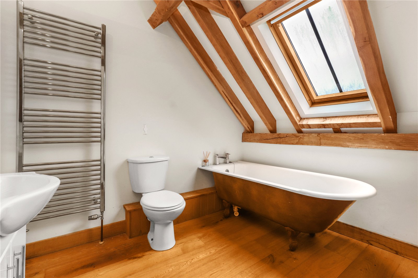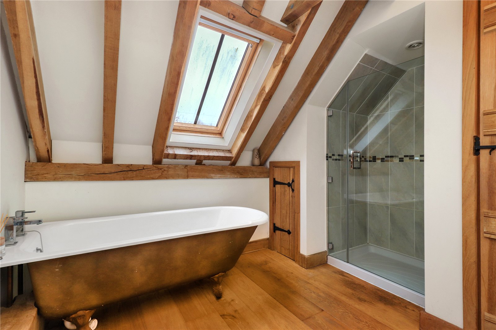 FAMILY BATHROOM / SHOWER ROOM: A beautiful antique styled Victorian influenced suit comprising of a rolltop bathe with ball and claw feet, chrome mixer tap, oak floors, W.C., wash basin with vanity unit under, chrome wall mounted heated towel rail, heavy glazed fronted shower with tiled walls and shower control system, vaulted beamed ceiling, beamed walls, downlighting, Velux styled window with views.