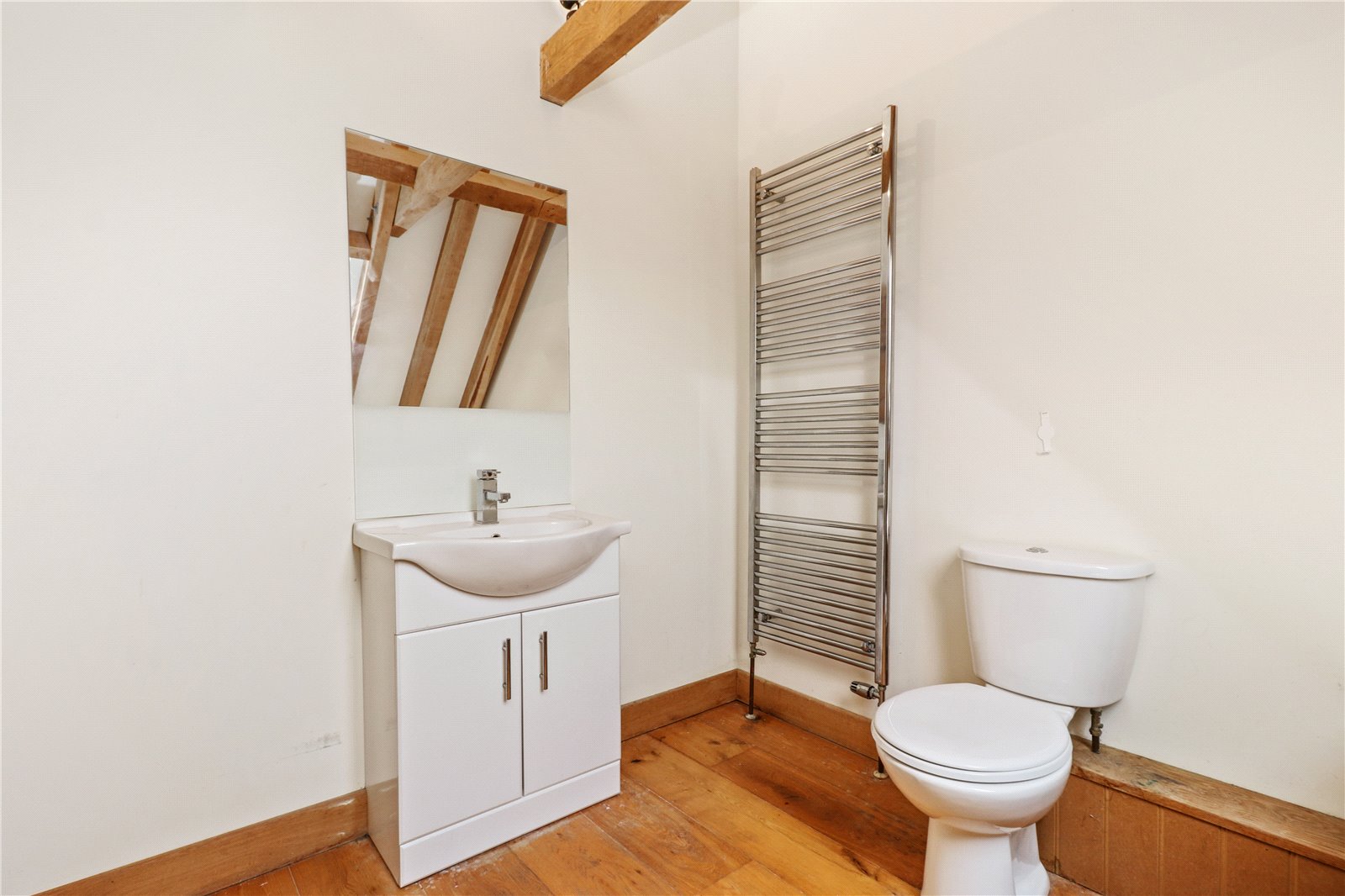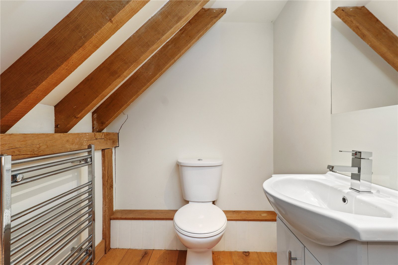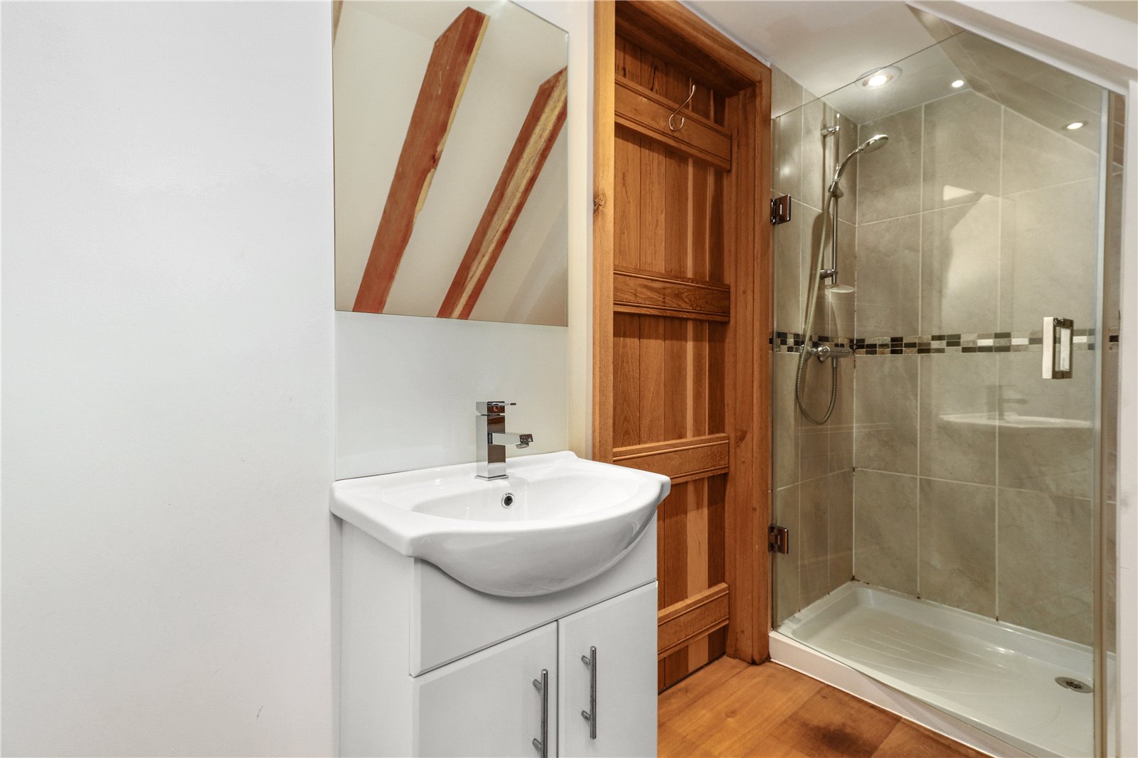 ENSUITE SHOWER ROOM: Comprising of oak floors, W.C., wash basin with vanity unit under, chrome heated towel rail, oak beams, heavy glaze fronted shower with tiled walls and chrome shower control system.