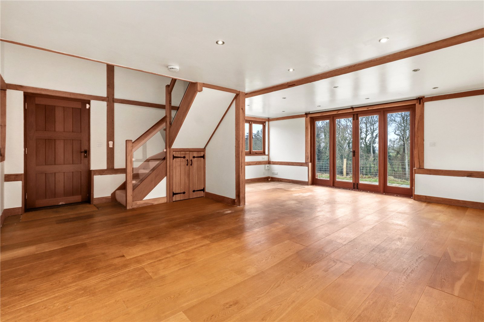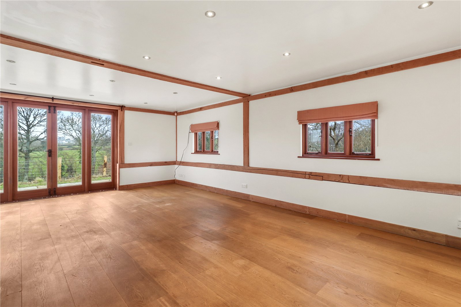 SITTING ROOM: Also, an open plan and naturally light room with a continuation of the oak floors. Further downlighting, oak skirting and exposed oak beams to walls and ceiling. A triple aspect room with double glazed windows overlooking the front and rear gardens, as well as oak framed double glazed French doors opening to the side garden and with a delightful aspect over the adjoining paddocks beyond.