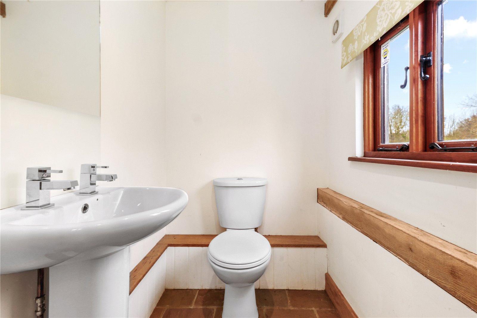 DOWNSTAIRS CLOAKROOM: With stone floor, W.C., pedestal wash basin, downlighting, oak plinths, extractor fan and double-glazed window with aspect to side garden.