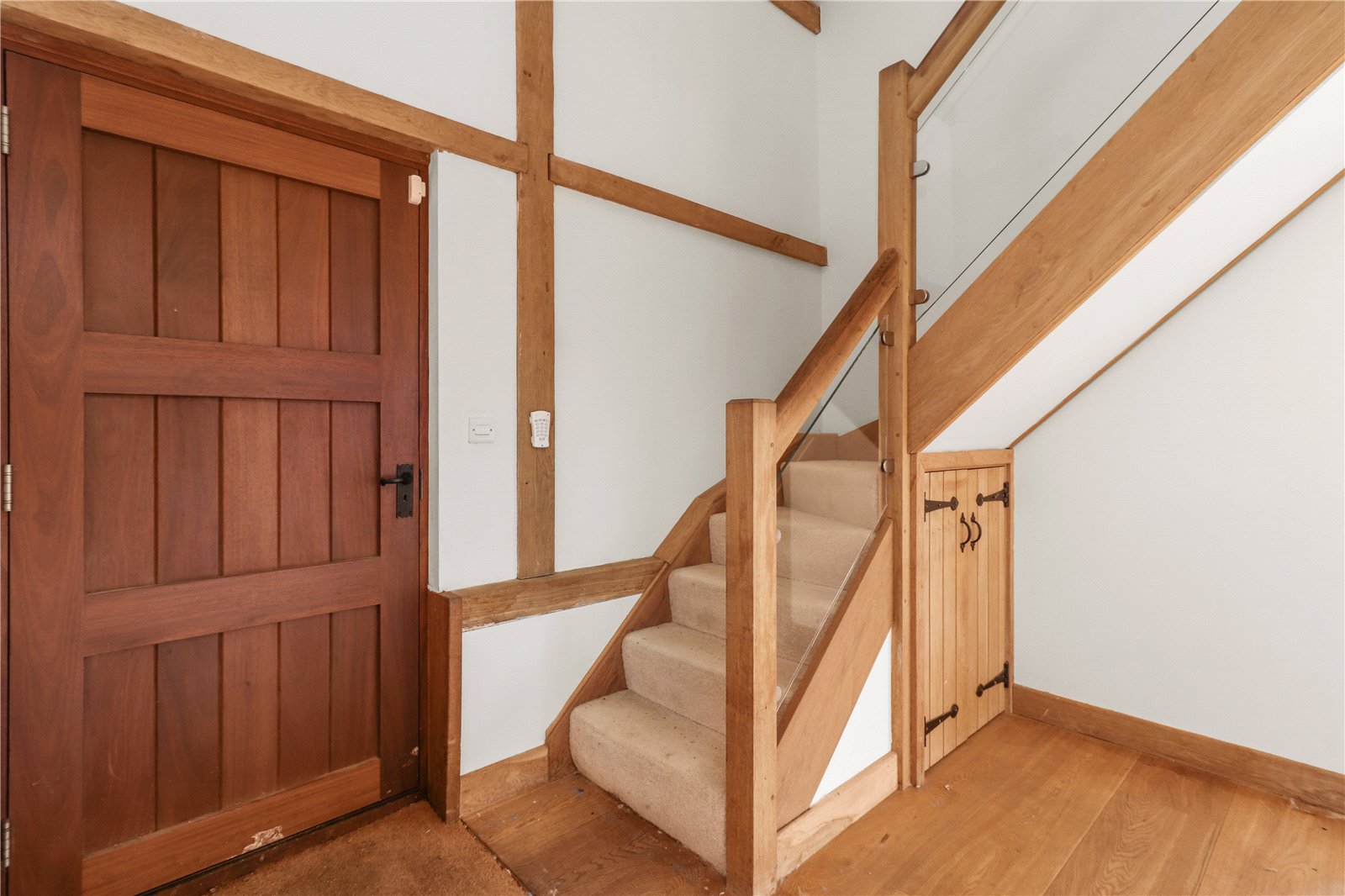 FIRST FLOOR LANDING: With splendid vaulted beamed ceiling, carpeted floor, oak and heavy glazed galleried area, doors leading off to three bedrooms and a family bathroom / shower room.