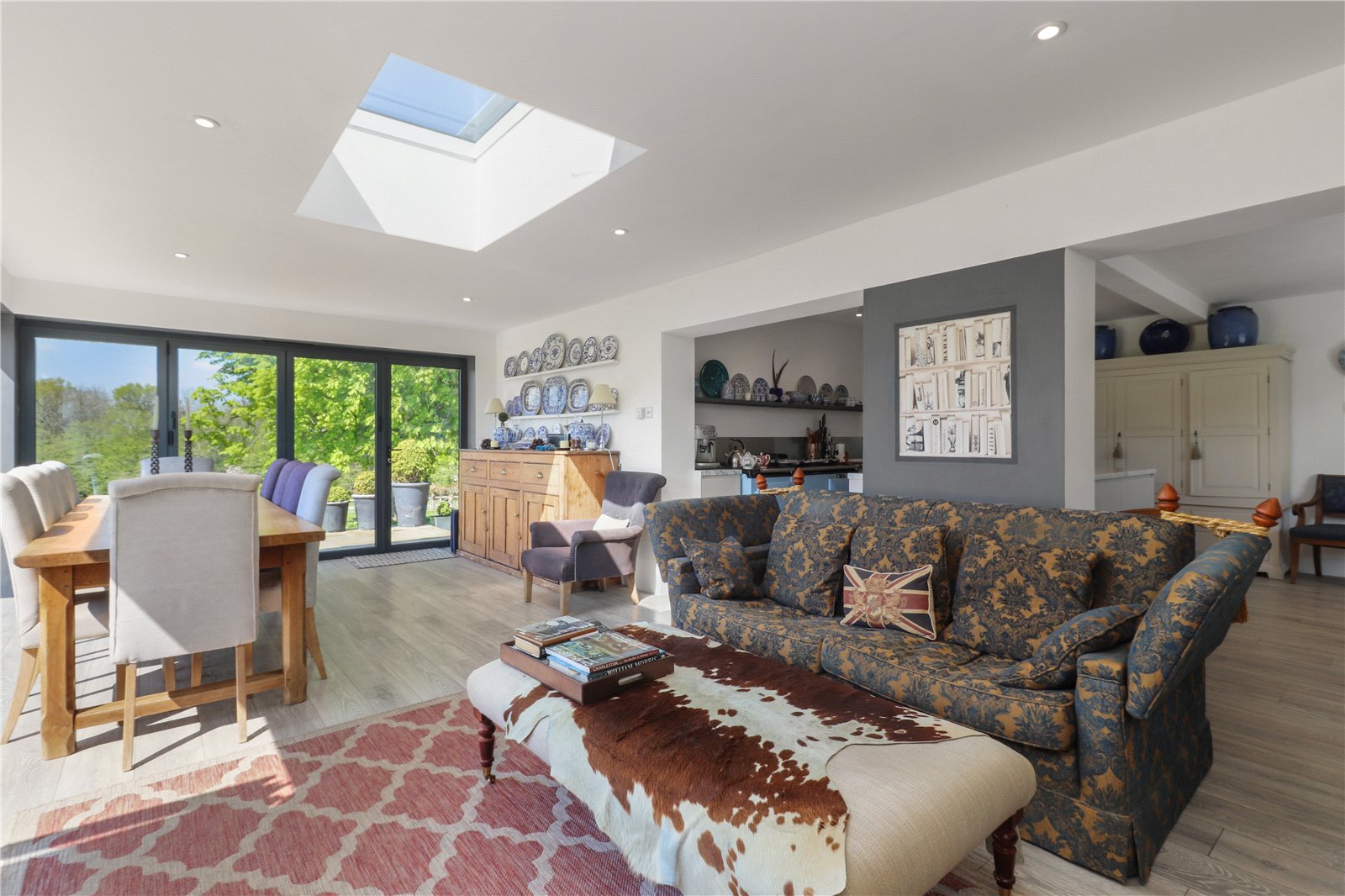 OPEN PLAN SITTING ROOM AND ADJOINING OPEN PLAN FORMAL DINING ROOM: A most breath-taking double aspect room with an immense amount of natural light and benefitting from beautiful panoramic views over the property’s adjoining six acres through its fully retractable bi folding doors, down lights, lime wash oak effect plank styled flooring. Directly outside are the adjoining Indian paved sun terraces, which are ideal for alfresco dining.