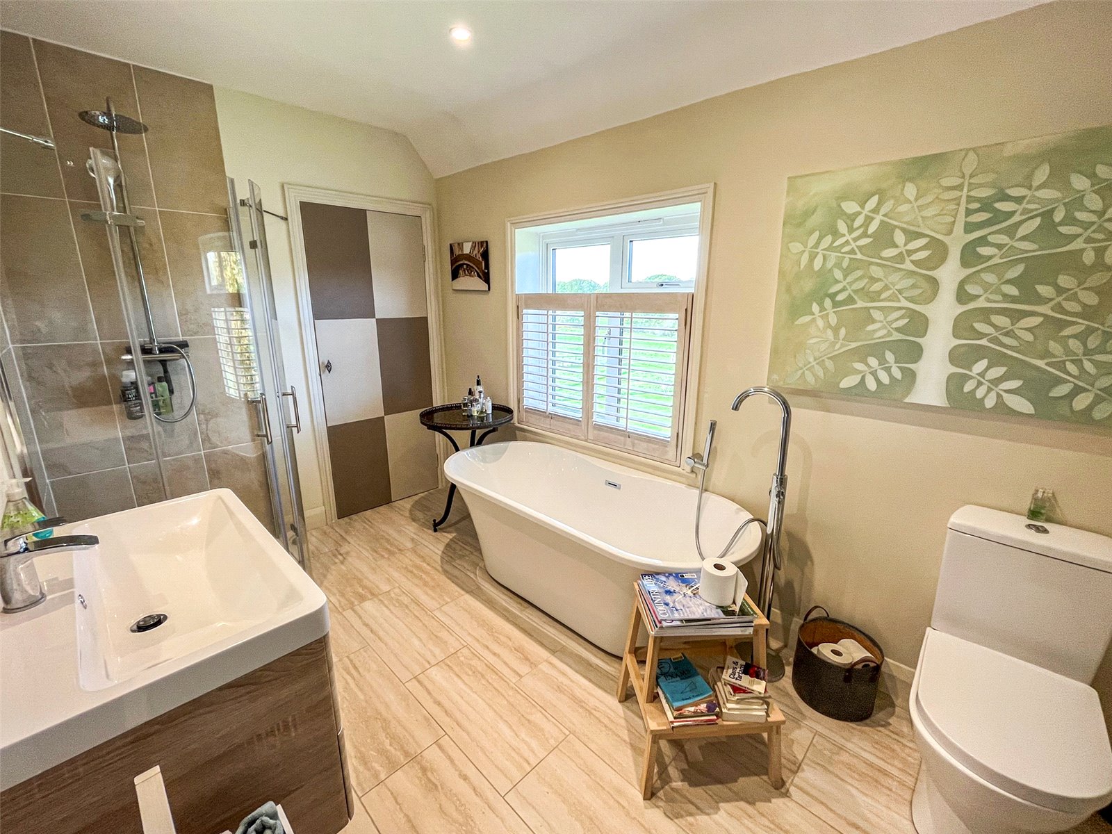 FAMILY BATHROOM / SHOWER ROOM: Recently fitted with a feature roll top slipper bath with chrome taps and separate shower control, W.C., feature wash basin, separate corner shower with heavy glazed sides with curved retractable doors with chrome handles, chrome shower control system, tiled walls, wall mounted heated towel rail, tiled floor, down lights, airing cupboard, window with aspect to side garden and splendid breath-taking views beyond.