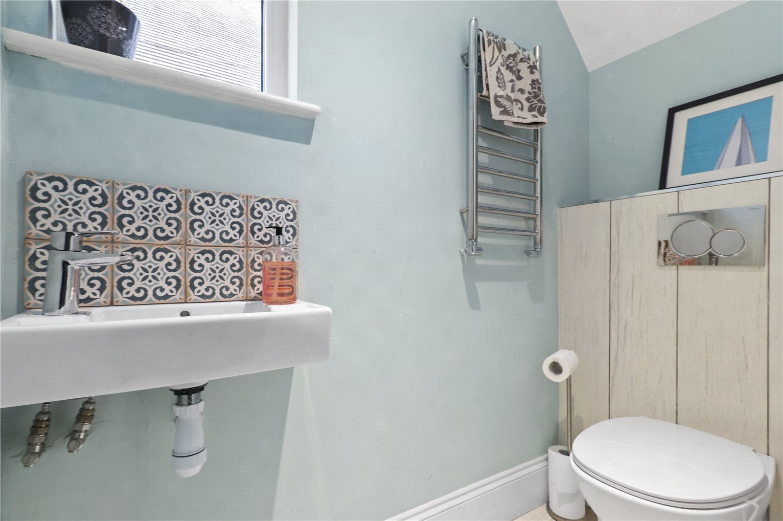 2ND CLOAKROOM ON FIRST FLOOR MEZZANINE: Comprising of a low level W.C. with concealed cistern, limewash effect wood styled tiled floor and side wall, chrome heated towel rail, corner wash basin with chrome tap and decorative tiled splashback, double glazed window to side.