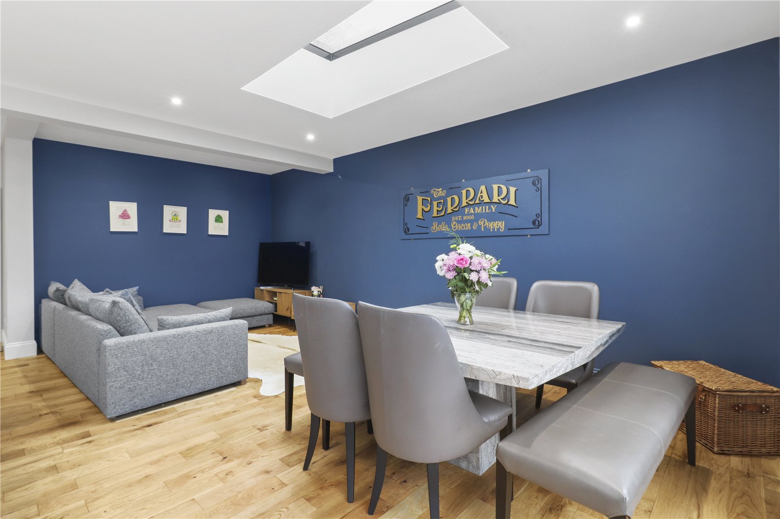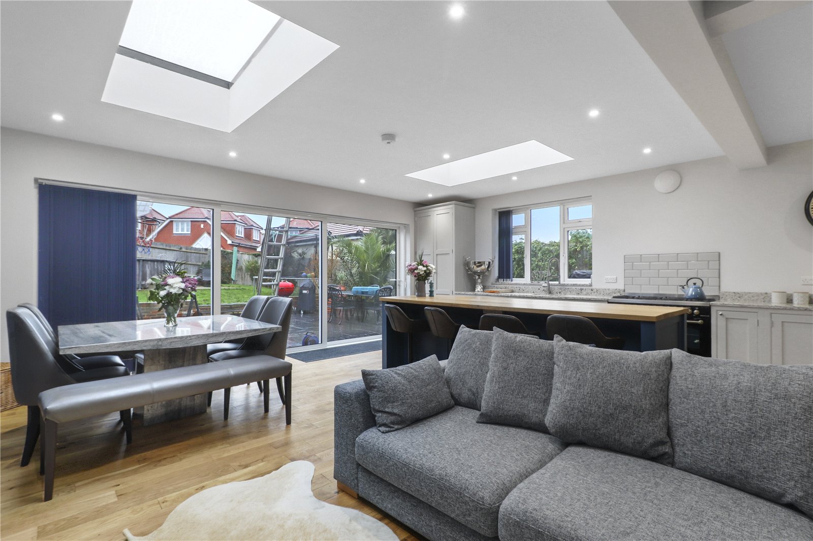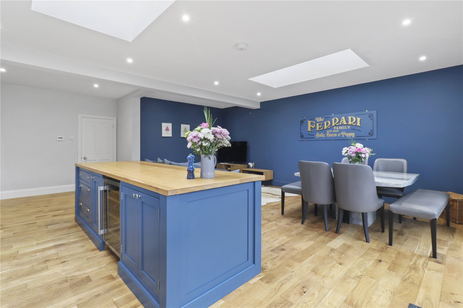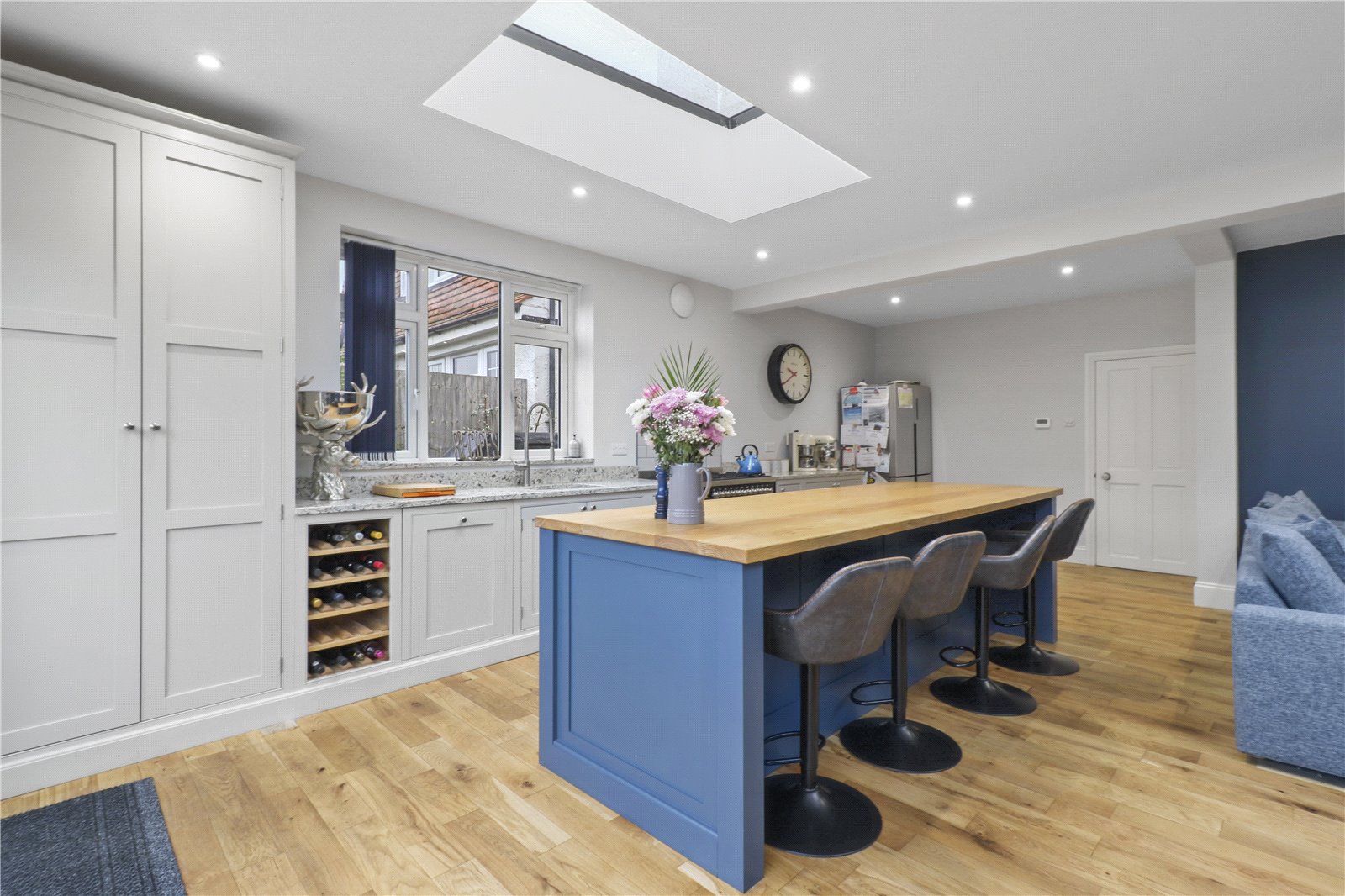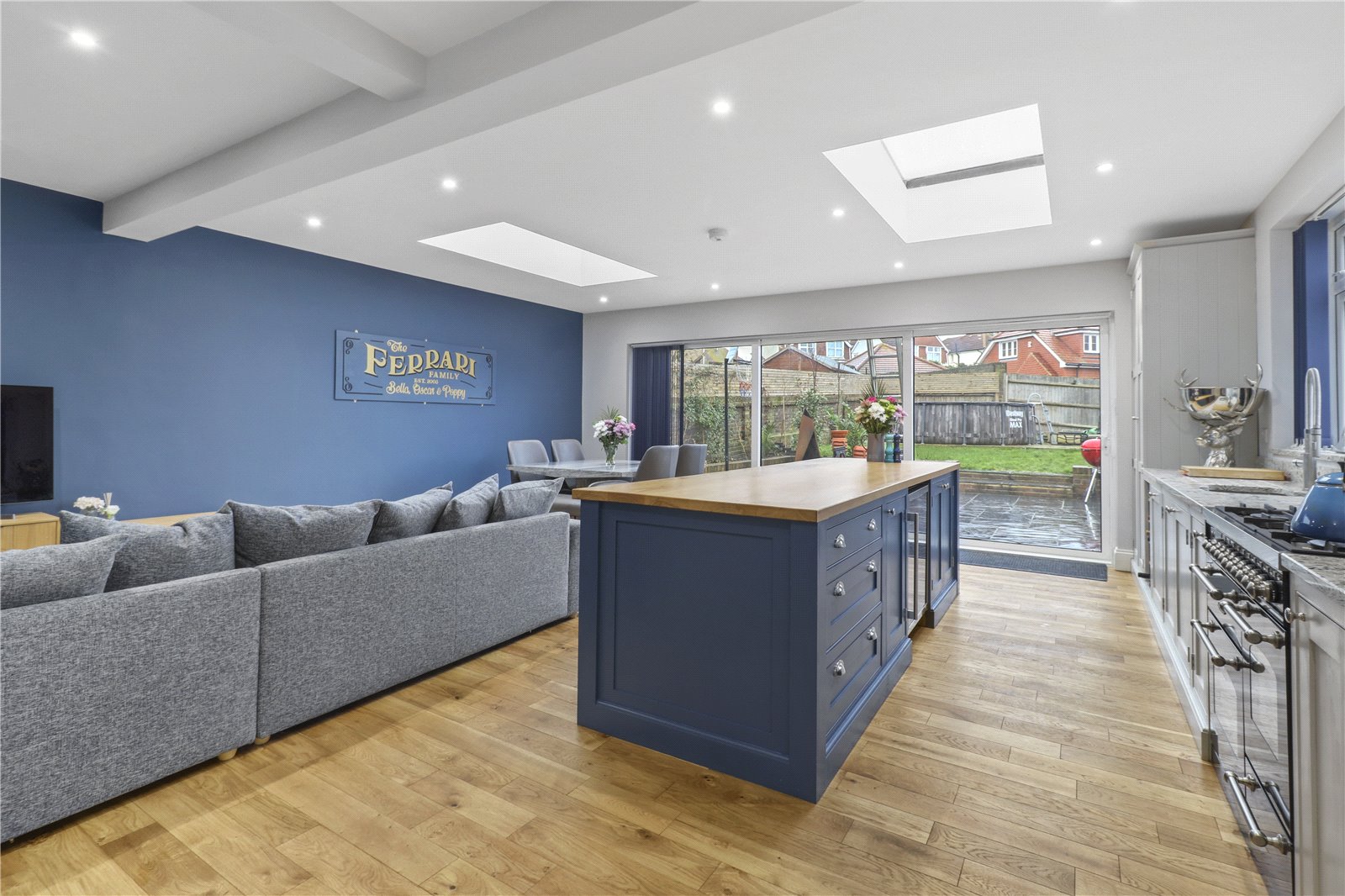 KITCHEN / BREAKFAST ROOM / DINING ROOM ALSO WITH LOUNGE AREA: An impressive and extensive range of bespoke refitted hand crafted and painted solid wooden cupboard and base units with quartz worktops and further specialist imported oak worktop / breakfast area, wine rack, inset 1 ½ stainless stell sink unit, brushed steel mixer tap with extension for washing dishes etc, Britannia 6 hob range, CDA wine cooler, integrated dishwasher, space for large American style fridge freezer, central island with further bespoke painted units with elegant and substantial sized imported Ash top, downlighting natural ceiling sky lights, oak floors with underfloor heating, dining area, lounge area, substantial sliding concertina double glazed doors with aspect of rear landscaped garden.