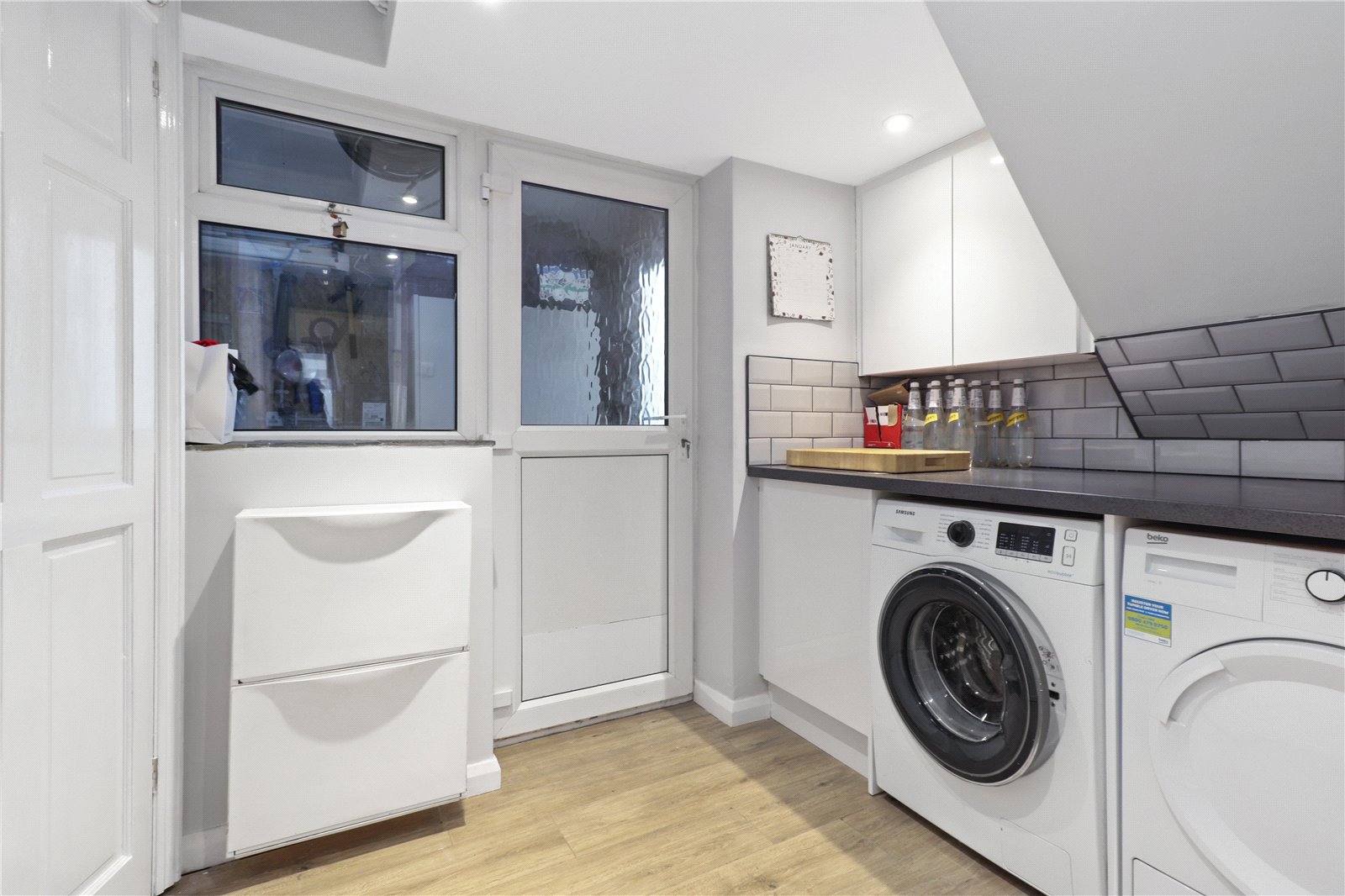 SEPARATE UTILTY ROOM: With oak effect tiled floor, radiator, space and points for washing machine and dryer, worktop over with tiled surrounds, door to storage cupboard housing consumer units and boiler and unvented cylinder, downlights, double glazed window and door to adjoining workshop / further potential utility area.