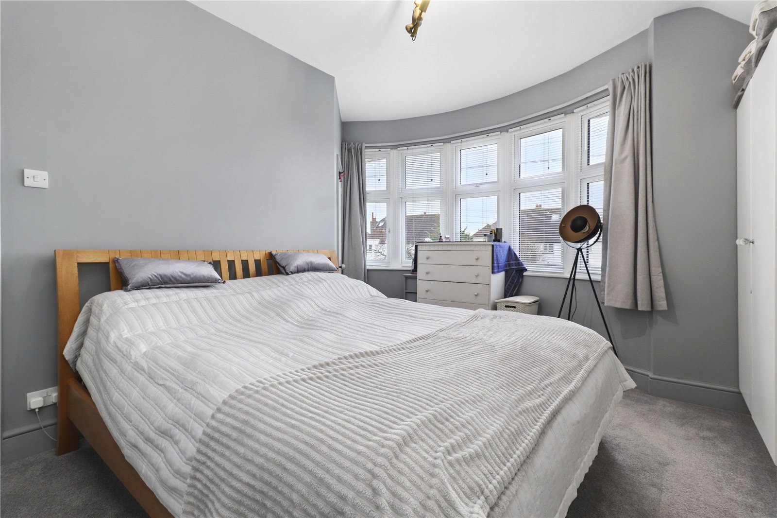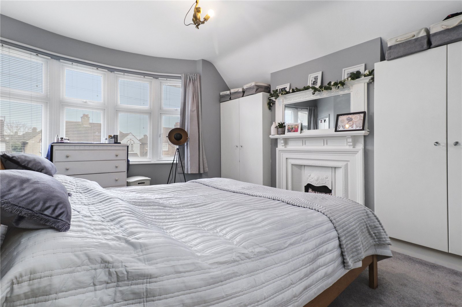 MAIN BEDROOM ONE WITH ENSUITE SHOWER / WET ROOM: A double sized room with sound proof glazing, beautiful arts and crafts influenced cast iron fireplace and painted wood surround, radiator, fitted twin wardrobe cupboards, elegant bay window with double glazing and aspect to front, door leading to ensuite shower / wet room.