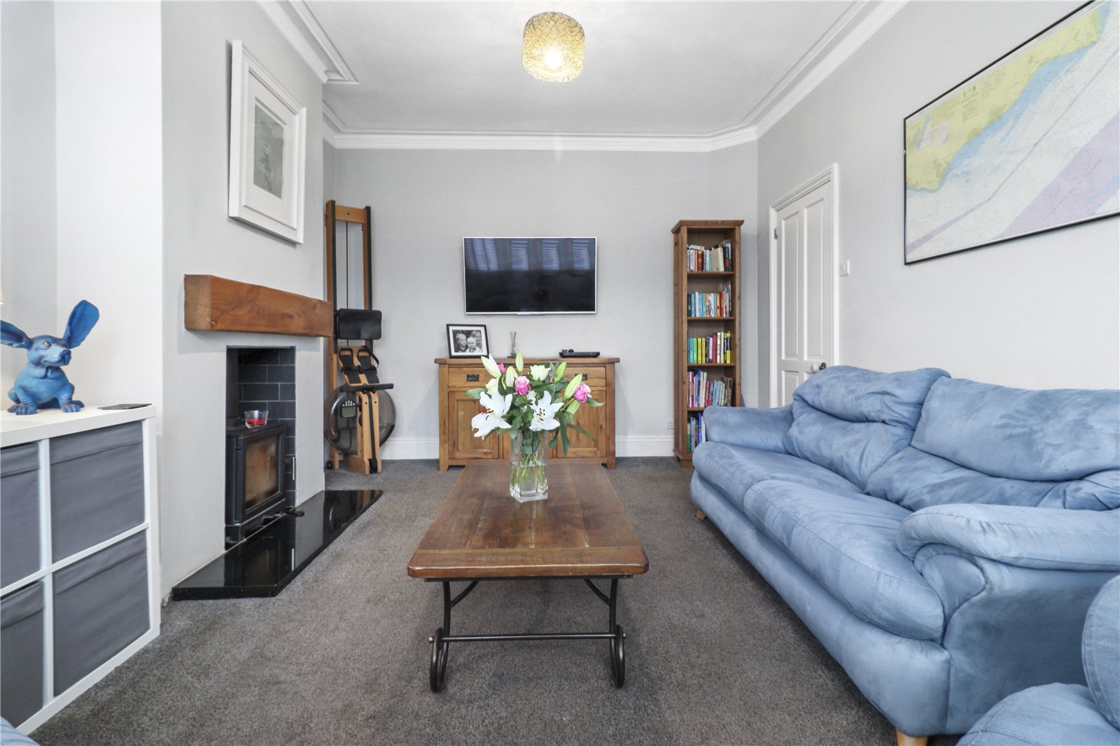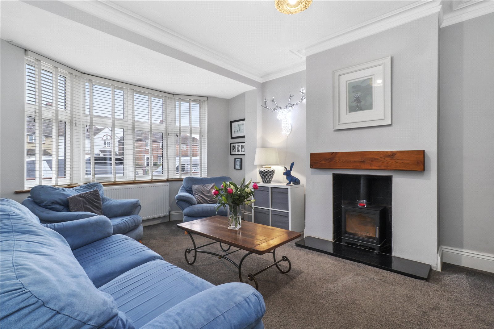 SITTING ROOM: With sound proofed glazing, original cornicing, feature fireplace with new liner 2020, that has an incorporated wood burner and substantial wood bressummer beam over, granite hearth and tiled recessed area, radiator, elegant bay window with double glazing and aspect to front.