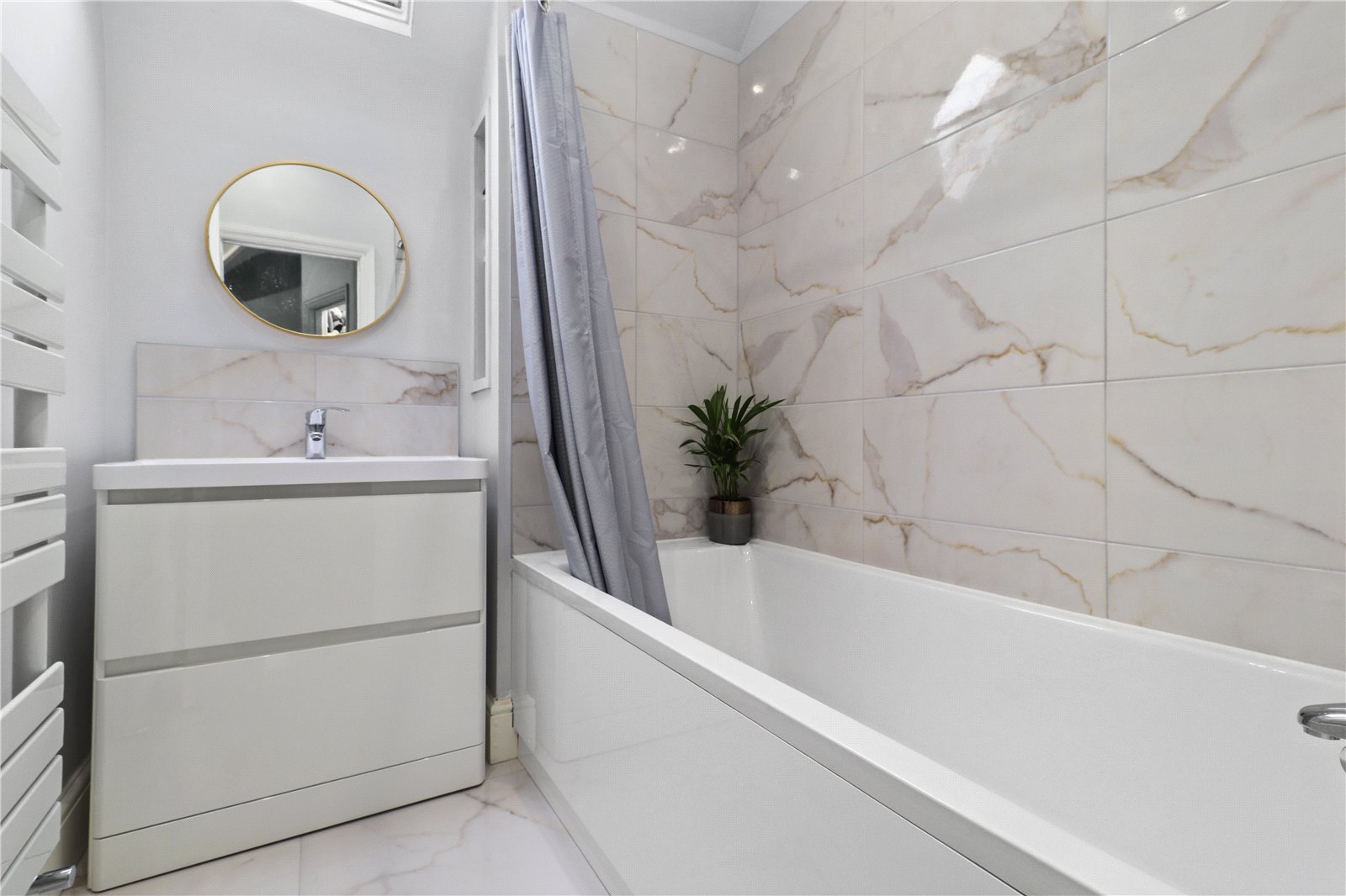 FAMILY BATHROOM / SHOWER ROOM: With large panelled bath and shower curtain with shower area to one end, porcelain tiled surrounds and walls, tiled floor, feature wash basin with high gloss vanity unit under, chrome mixer tap, tiled splash back, wall mounted heated towel rail, fitted inset storage compartments, Velux style window to ceiling.