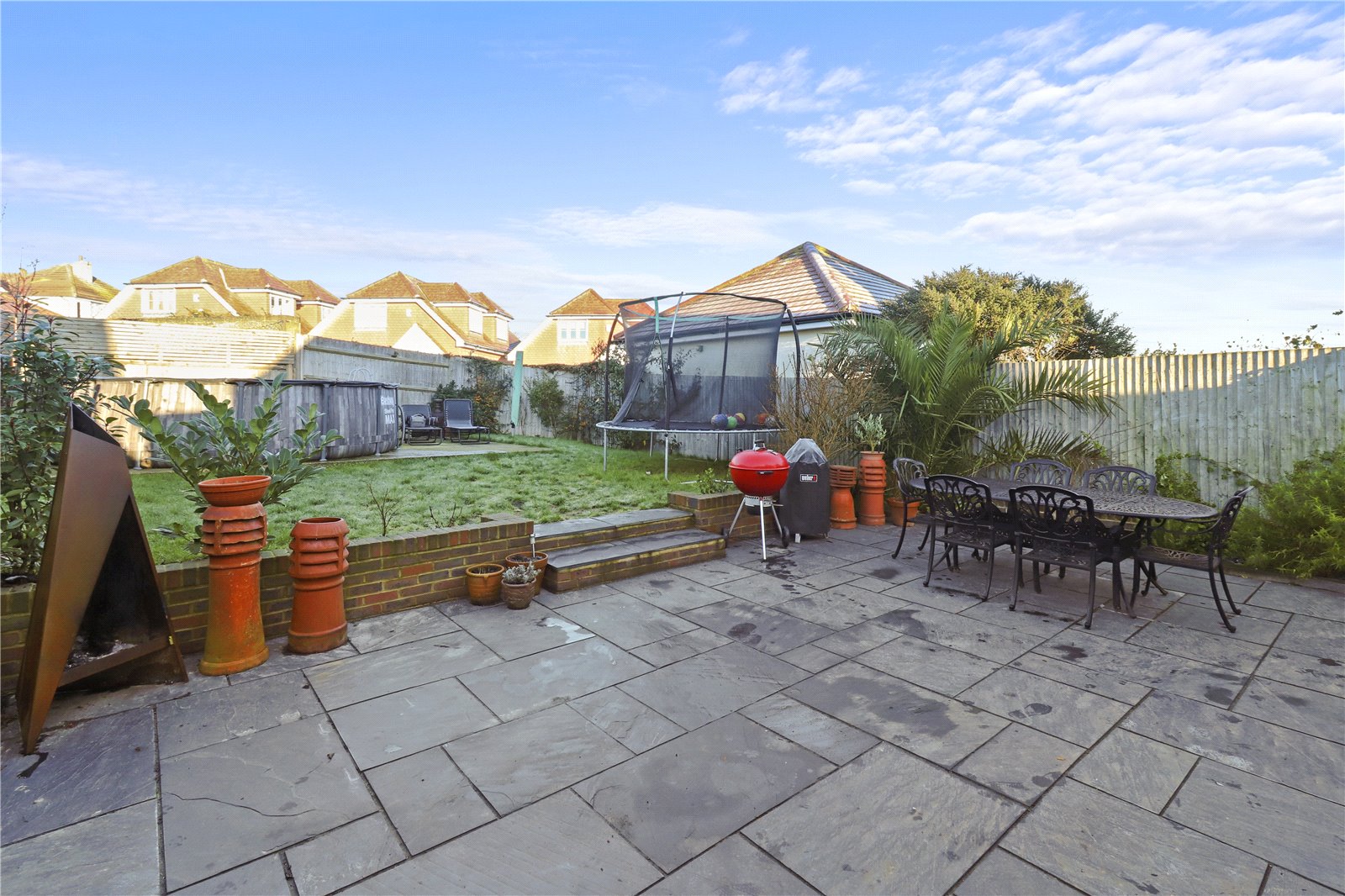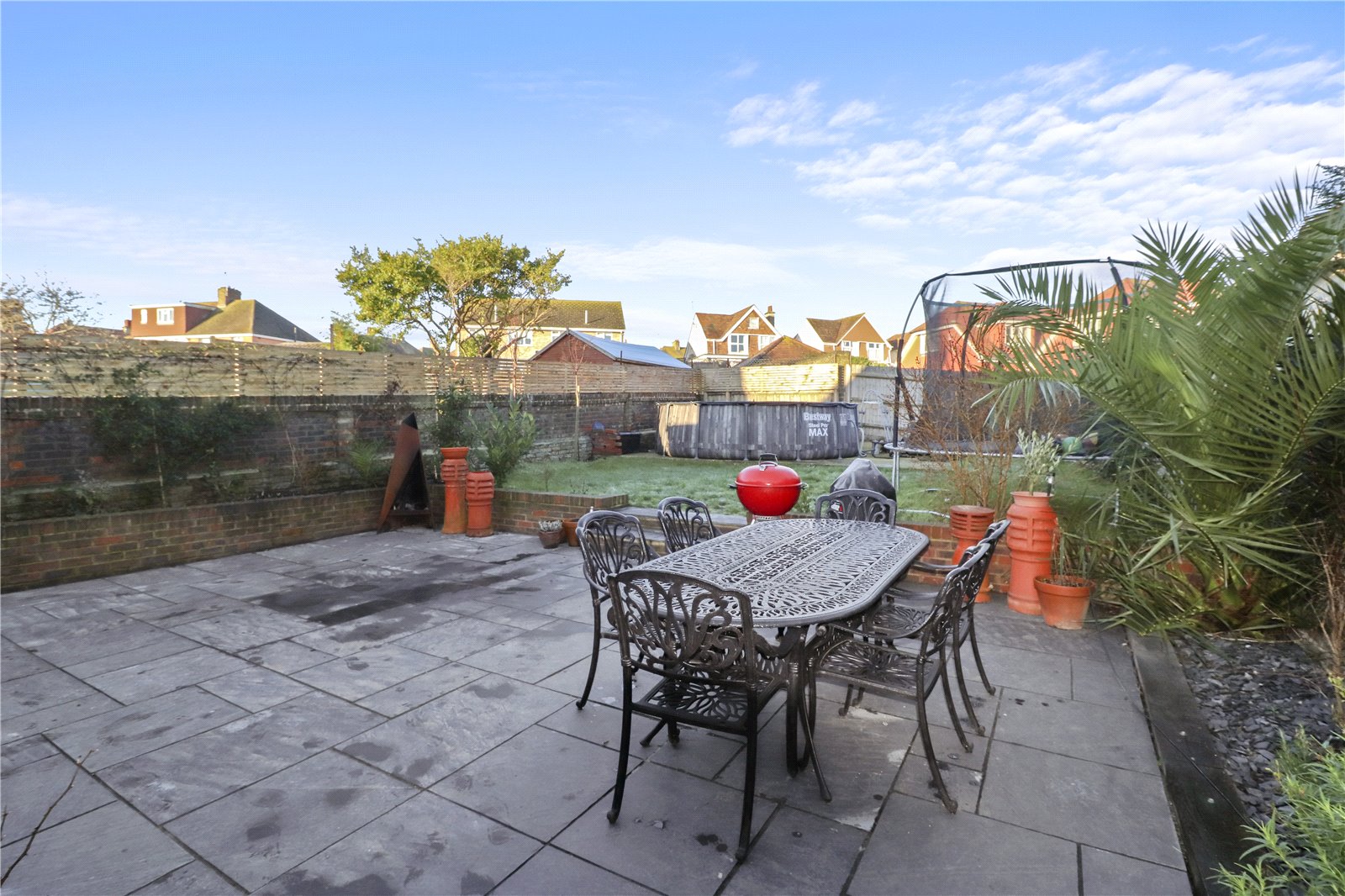 REAR GARDEN: Having been tastefully and extensively landscaped. Presently arranged with a lovely stone paved patio / sun terrace with bespoke low brick retaining and decorative walls, raised and level stocked flower borders, outdoor lighting and power points, steps leading up to level lawned areas and further section with a raised outdoor pool (14 foot diameter) .