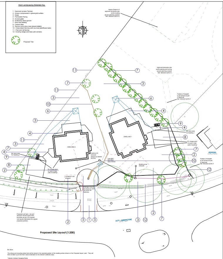 DETACHED TWO BAY CARPORT /: Natural slate pitched roof with wooden slatted sides and a concrete base. Car charging point.