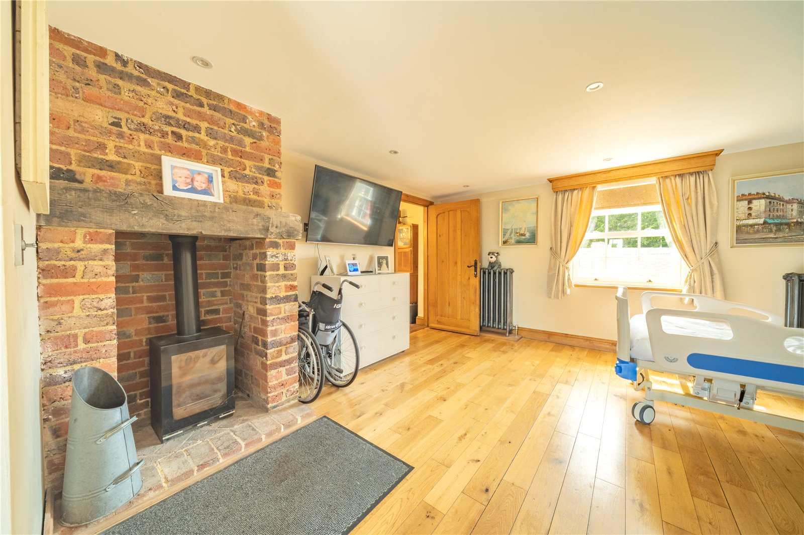 GROUND FLOOR ANNEXE: This versatile ground-floor annexe room offers a bright and spacious setting, ideal for a variety of uses. Currently arranged as a self-contained space, it benefits from wooden flooring throughout, dual-aspect windows that flood the room with natural light, and French doors opening onto the garden terrace. A feature brick fireplace with a wood-burning stove creates a warm focal point, while the fitted kitchenette — complete with wooden cabinetry, integrated oven, and extractor — provides excellent practicality. This room is well-suited as an independent living area, guest suite, or home office, making it a highly flexible addition to the property.
