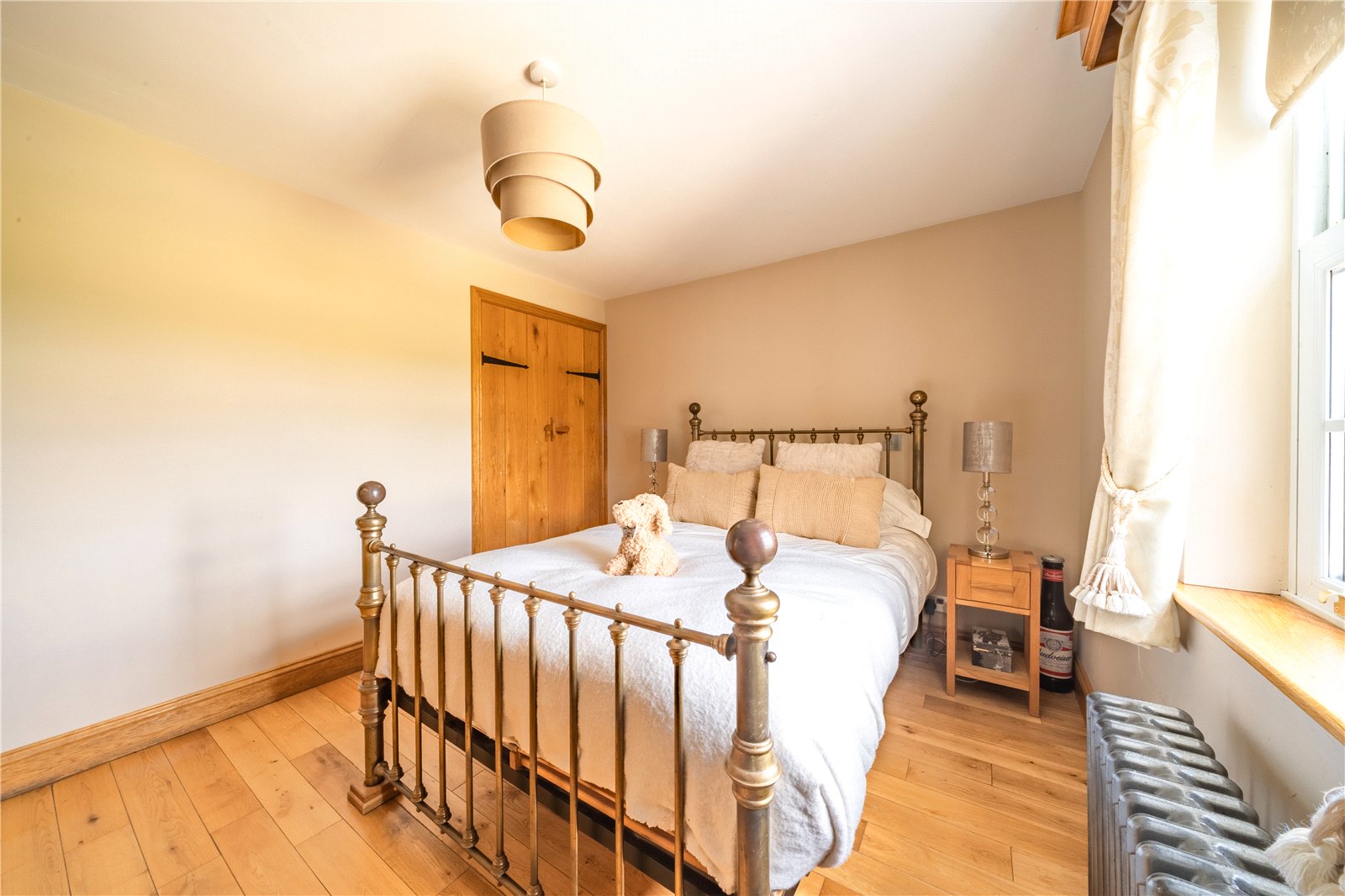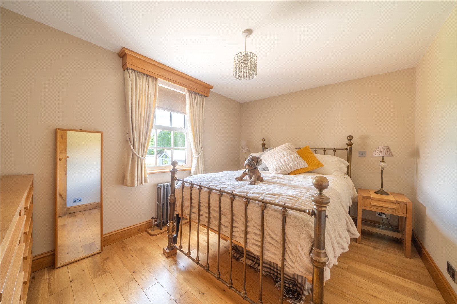 BEDROOM 1: This attractive bedroom enjoys an abundance of natural light, with windows to two aspects framing wonderful views of the surrounding countryside. Finished with warm wood flooring and neutral décor, the space feels calm and inviting, perfectly suited for relaxation. A set of French doors opens directly onto a private balcony, creating a seamless indoor-outdoor connection and providing a delightful spot to enjoy the setting. With built-in storage and ample room for furnishings, this bedroom offers both practicality and charm, making it an ideal choice as a principal or guest room.