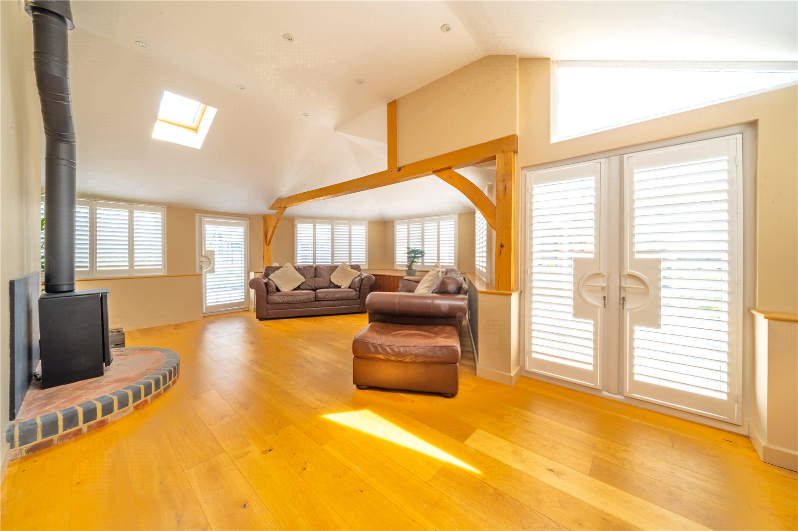 FAMILY ROOM: This spacious family room is a wonderfully bright and inviting living space, designed with both comfort and style in mind. Vaulted ceilings with twin skylights and extensive windows fitted with plantation shutters allow natural light to flood the room throughout the day, while the exposed oak beam adds a touch of character and warmth. A central wood-burning stove, set upon a brick hearth, creates a cosy focal point perfect for colder months. The generous layout easily accommodates multiple seating areas, with attractive wood flooring enhancing the sense of flow and space. French doors open directly onto the garden, providing a seamless indoor-outdoor connection ideal for family living and entertaining.