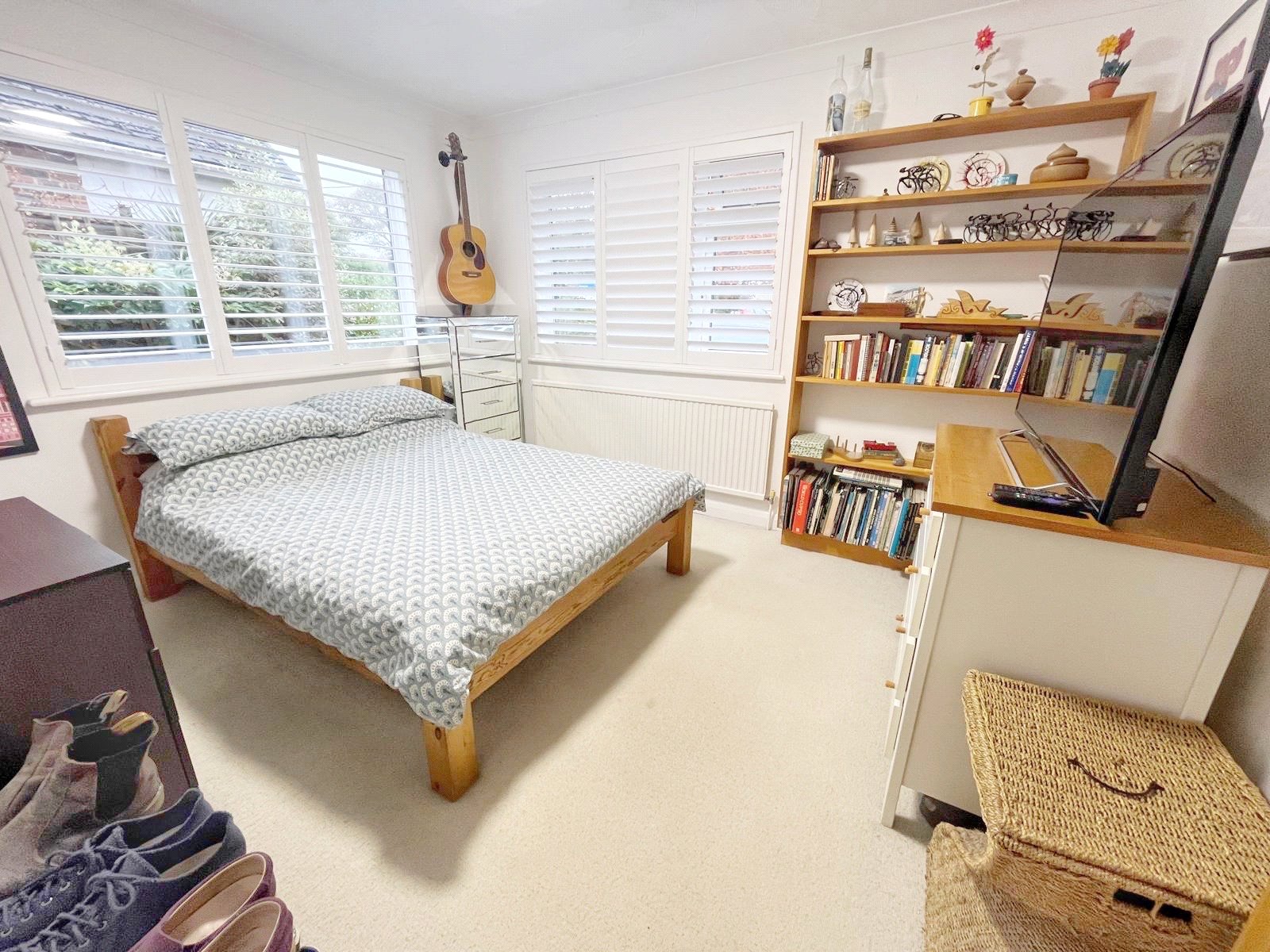 BEDROOM THREE: A double sized and double aspect room with coved ceiling, radiator, double glazed windows with New England style internal shutters and aspects over the front gardens and driveway.