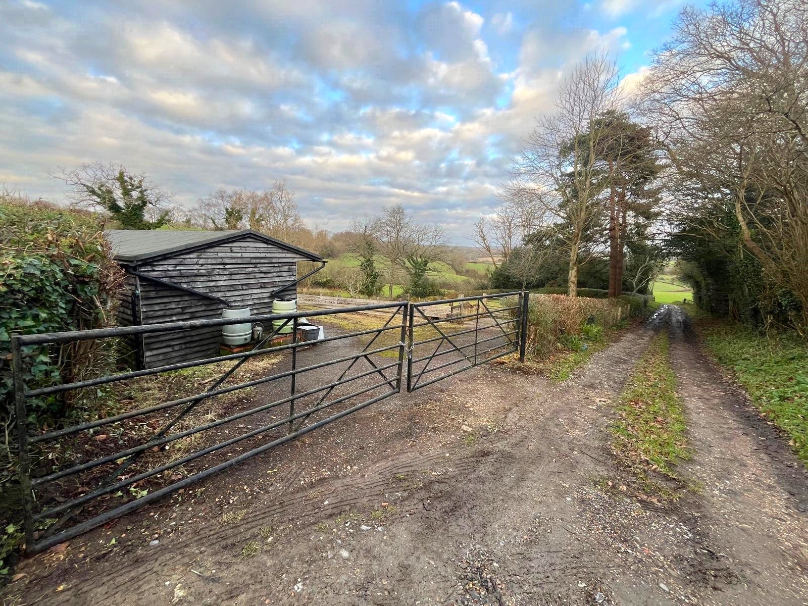 The site is accessed from a private lane via twin large metal commercial sized gates. The private lane leads off from the main road.