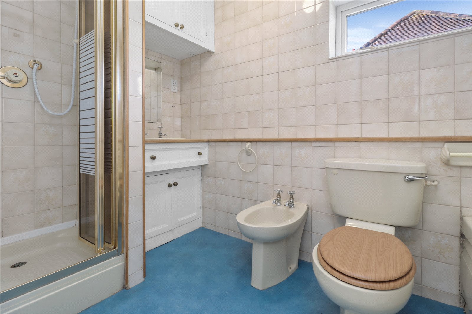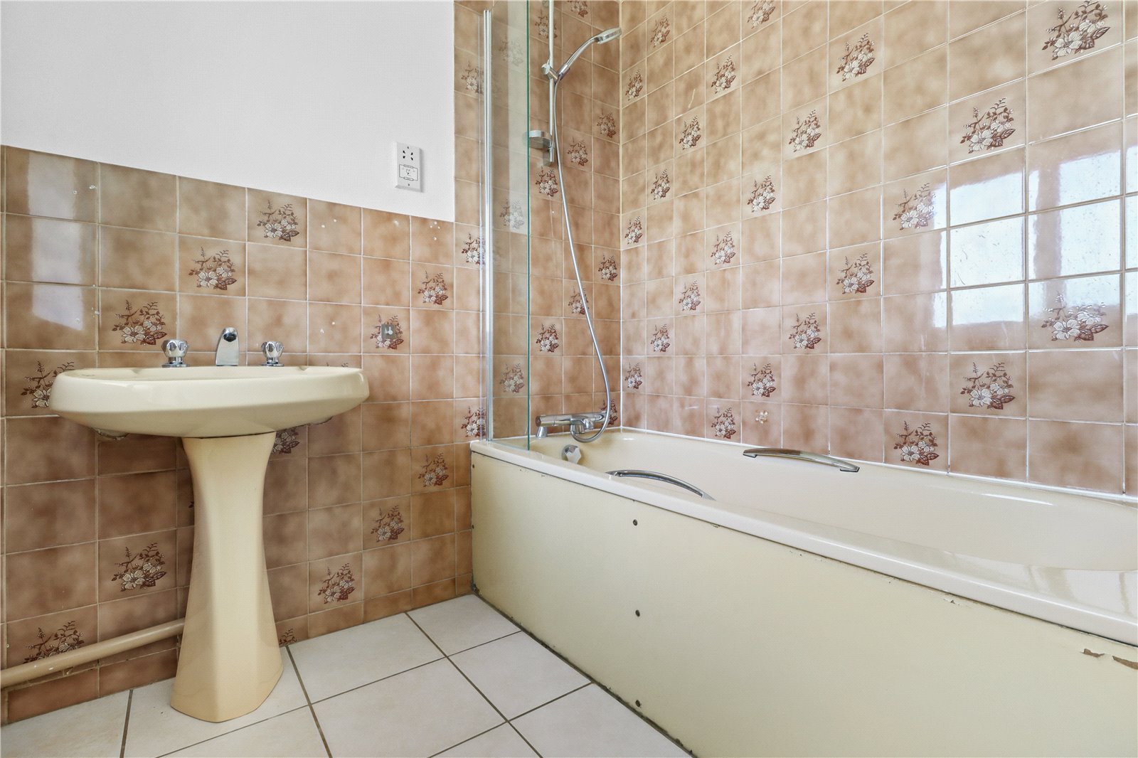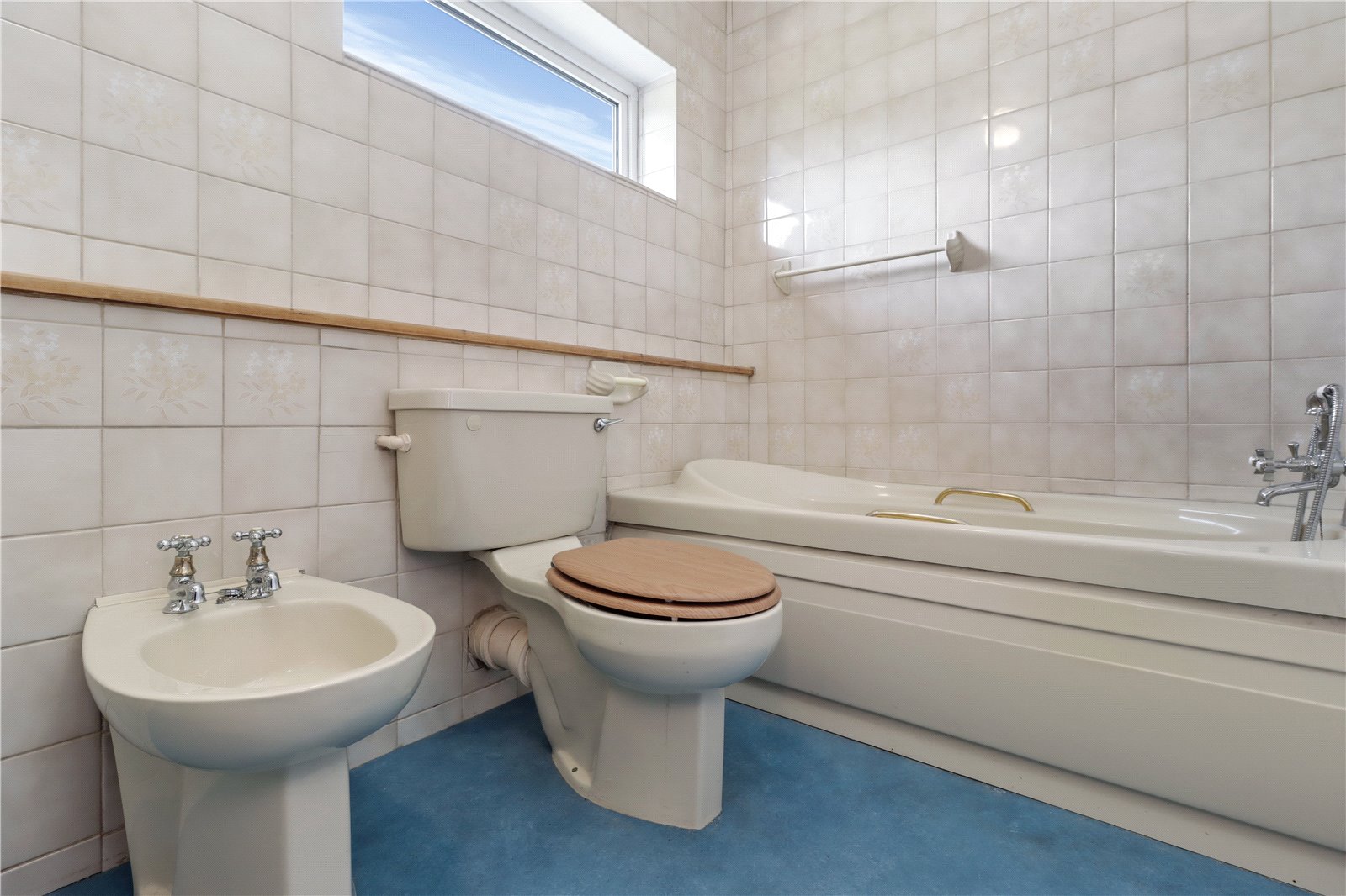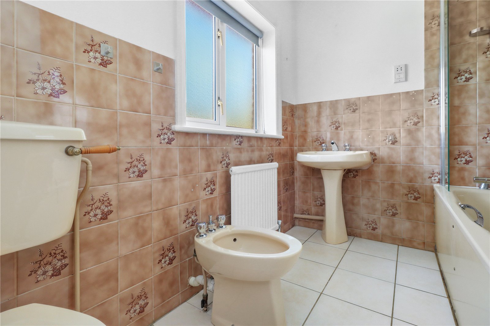 FAMILY BATHROOM: Approached by original feature wooden door, with tiled floors and half tiled walls, fitted large panelled bath with chromed mixer tap and shower attachment, low level WC, pedestal wash basin with chrome mixer tap, radiator, ceiling light, double glazed window overlooking beautiful rear landscaped garden.