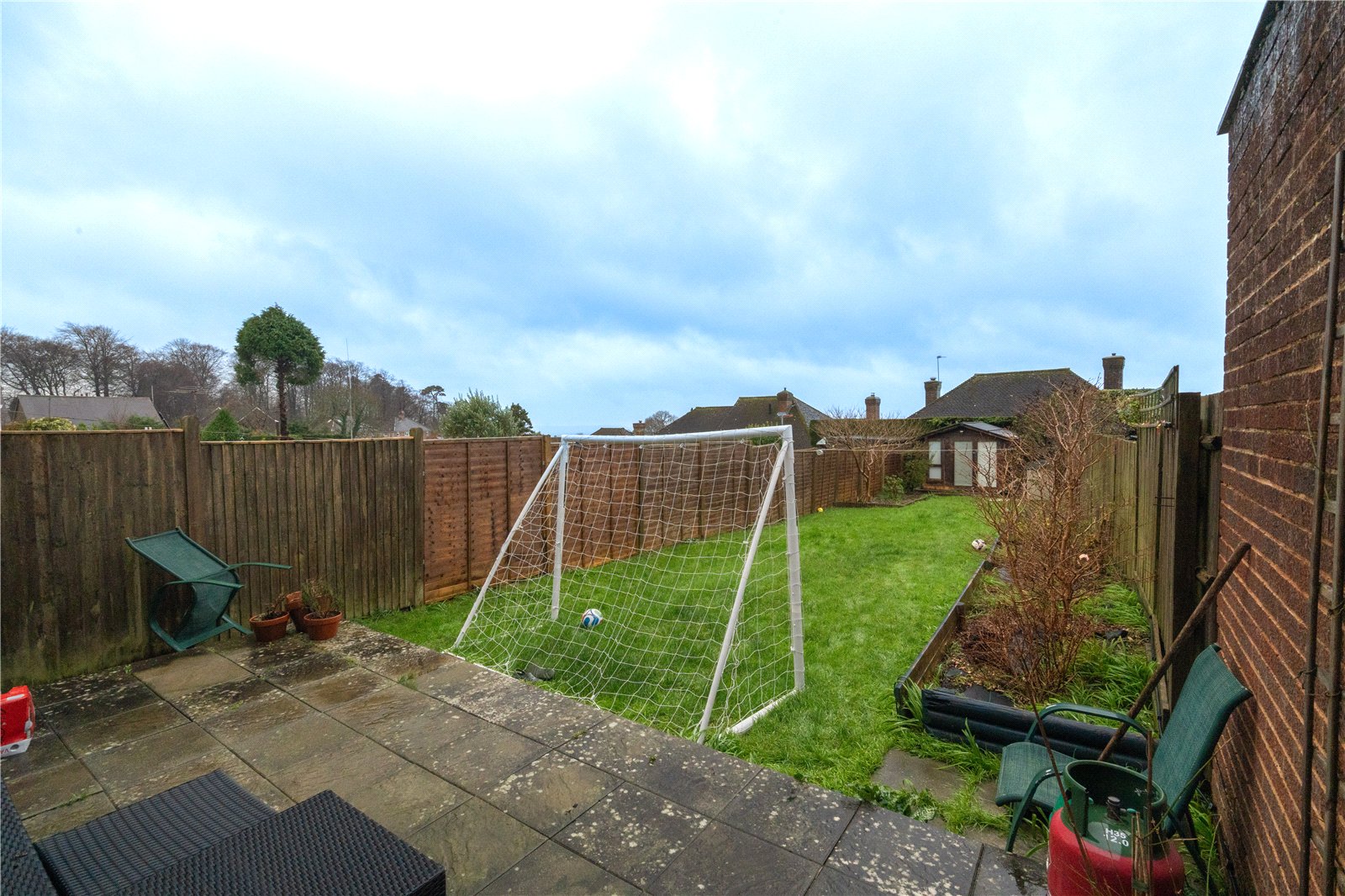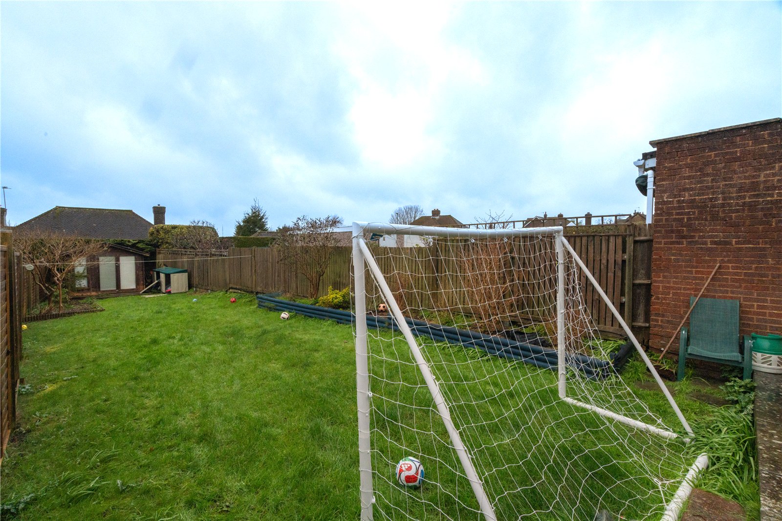 The garden is fully enclosed with timber fencing, offering a good degree of privacy, and features established borders with shrubs and planting. To the rear of the garden sits a timber shed, providing useful outdoor storage. Overall, this well-proportioned outdoor space offers versatility and scope to further landscape or personalise.