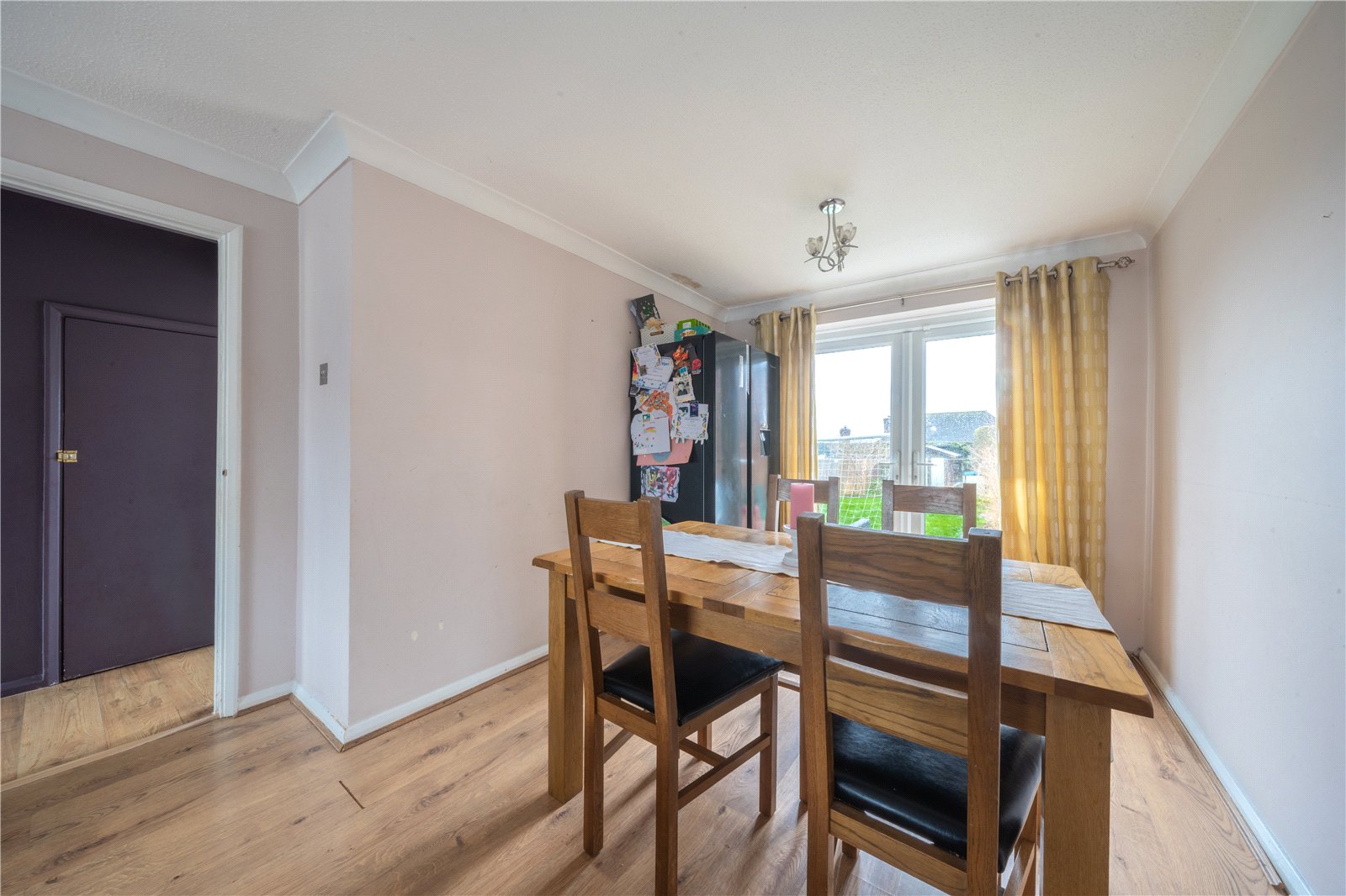 The dining area sits comfortably to the rear, with ample space for a family-sized dining table and chairs, making it ideal for everyday dining and hosting. Glazed doors open directly onto the garden, enhancing the sense of space and providing a seamless connection between indoor and outdoor living. Finished with wood-effect flooring throughout, this versatile room is well suited to modern family life.